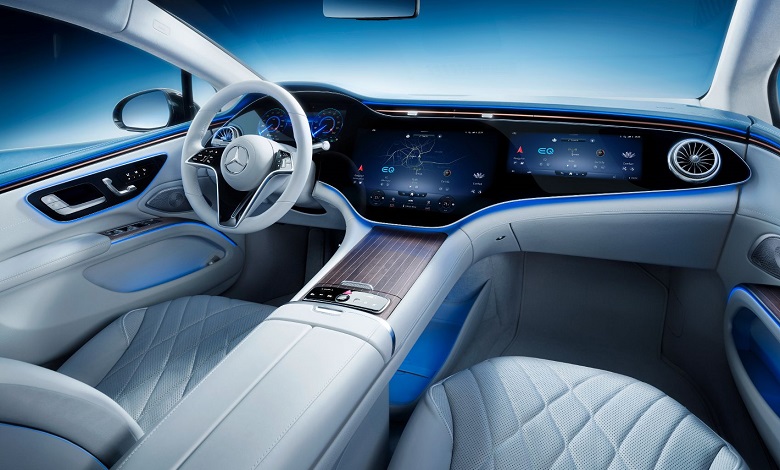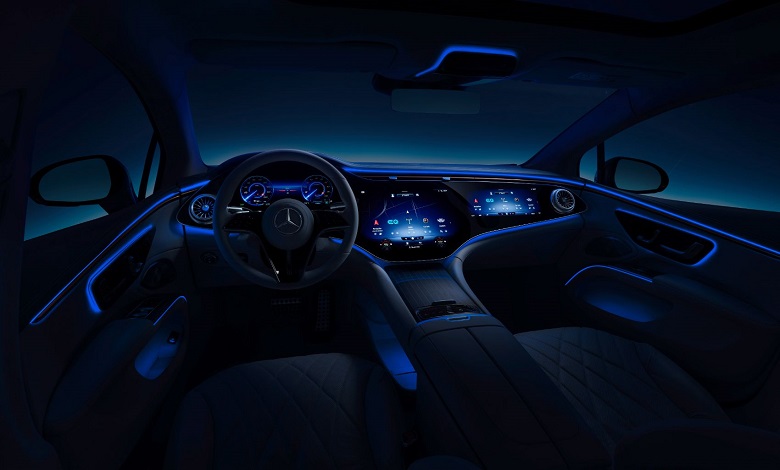 Jedro in bistvo so trije sicer ločeni veliki zasloni, en za voznika, drugi za sovoznika in tretji nameščen na sredini. V osupljivo celoto jih povezuje steklena površina, ki se razteza praktično od stebrička do stebrička. Celotna površina je seveda občutljiva na dotik, upravljanje pa je kakopak možno tudi s kretnjami rok. Sistem je podprt tudi z umetno inteligenco, tehnologijo za prepoznavanje obraza in biometrično overjanje lastnikove identitete. V kabini sta le dva fizična gumba in sicer tisti za vklop in izklop električnega pogonskega sistema in drugi za vklop vseh smernikov.