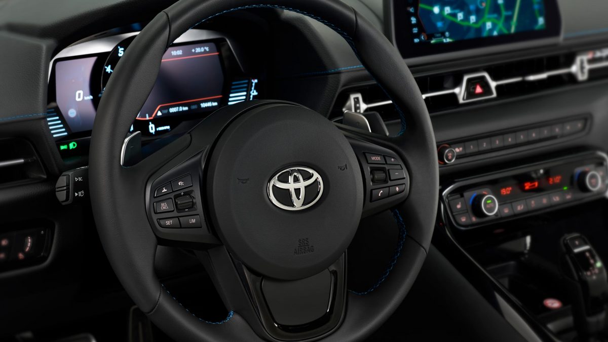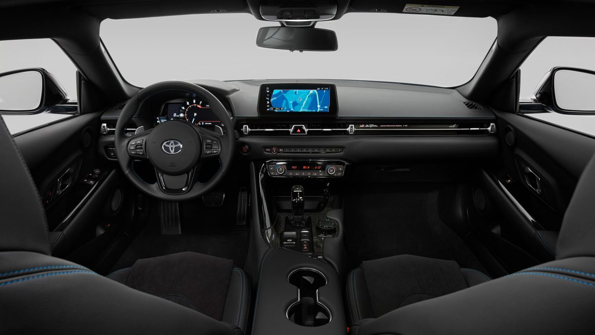 Osnovna oprema vključuje digitalne merilnike, 8,8-palčni informacijski sistem, ozvočenje z 10 zvočniki in povezljivost z Apple CarPlay ter Android Auto storitvama. Na področju varnosti so posebni Supri serijsko namenili Safety+ paket, ki prinaša zaviranje v sili, adaptivni tempomat, prepoznavanje prometnih znakov in pripomoček za uravnavanje snopa svetlobe.