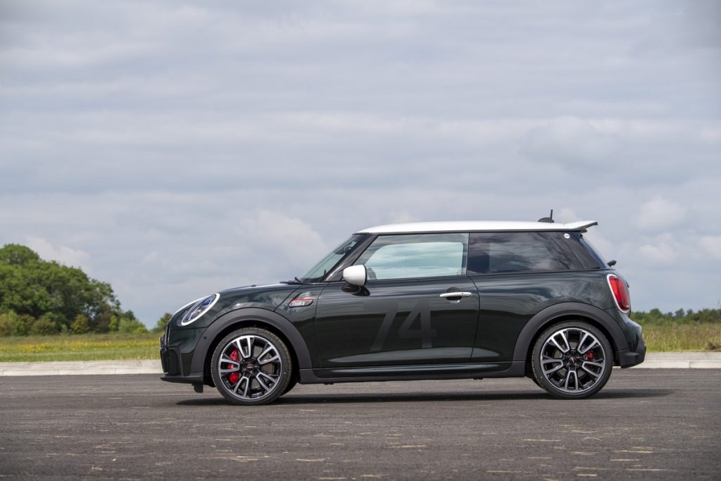 V primerjavi s standardnim Minijem JCW posebnež ni prejel mehanskih sprememb, ohranja 2-litrski turbobencinski motor z 231 KM in 320 Nm navora, dovolj za poskok do stotice v dobrih šestih sekundah ter doseg najvišje hitrosti 246 km/h. Po zmogljivosti torej ne bo izstopal, se pa razlikuje vizualno, odet v novo Rebel zeleno karoserijsko barvo, s kontrastno belo streho, kljukami vrat, zunanjimi ogledali in dirkaškimi črtami. Na pokrovu motorja in vratih se s številko 74 poklanjajo prvem zmagoslavnem Miniju Cooper, prav tako povsod najdemo manjše retro podrobnosti. V notranjosti armaturno ploščo krasijo podpisi treh generacij Cooperjev – dveh Johnov in Charlieja.