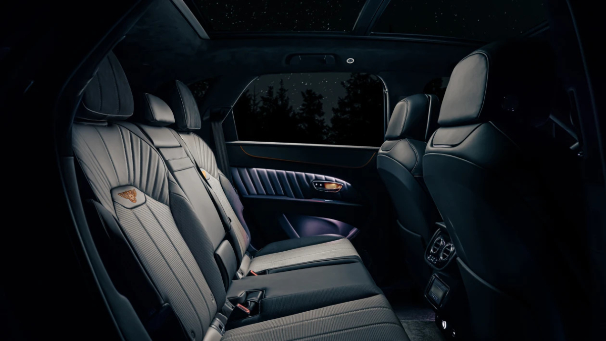 Armaturno ploščo vesoljske Bentayge krasi površina iz galaktične kamnine, z oranžnimi obrobami, podoben vzorec se nadaljuje na notranjih delih vrat. Oranžna barva je uporabljena tudi za sedežne obrobe, sredino volana, prestavno ročico in vezenje logotipa na naslonih sedežev. Preostanek notranjosti je odet v kombinacijo usnja Beluga in Porpoise, kar imitira črnino neba v kontrastu svetlejših elementov.