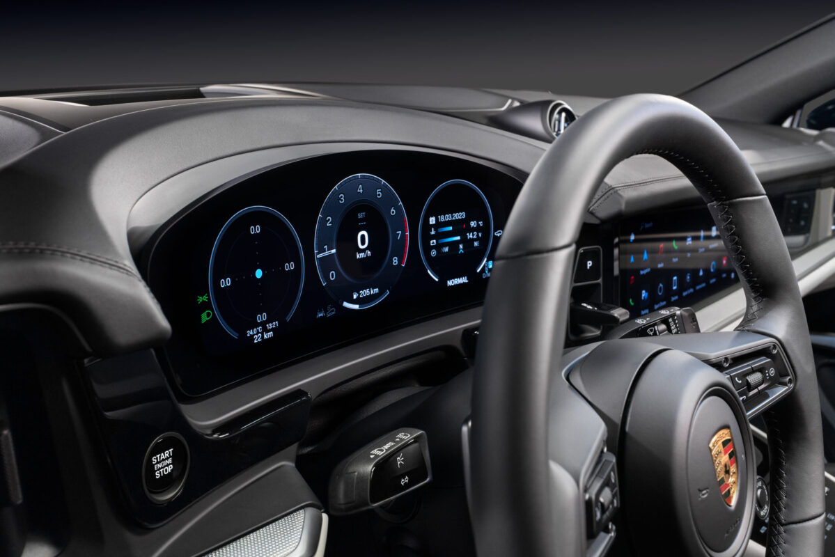 Pred voznikom se razprostira nov 12,6-palčni ukrivljen zaslon s prikazom merilnikov in ostalih voznih podatkov, sredino krasi 12,3-palčni zaslon na dotik z najnovejšim operacijskim sistemom, za razvedritev sopotnika pa bo poskrbel dodaten 10,9-palčni zaslon, s podporo pretočnih vsebin. Upravljanje klimatske naprave ostaja ločeno, z novo nadzorno enoto pod osrednjim zaslonom in zračniki. Za ključne funkcije, kot sta temperatura in količina pretoka zraka bomo lahko uporabili fizična gumba, za vse ostalo bo skrbela plošča s haptičnimi tipkami. Pri Porscheju z zadovoljstvom poudarjajo, da ostaja gumb za glasnost klasičen.