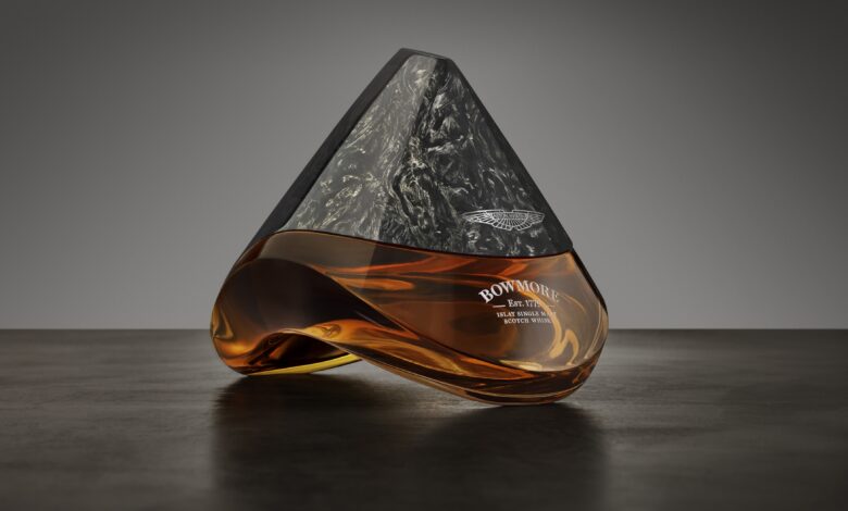 Pri Bowmoru so prispevali zares skrbno negovan in kar 52 let skrbno nadzorovan »vintage« enosladni viski, ki so ga seveda želeli zapakirati v neprekosljivo embalažo. Za slednjo so zaprosili kar oblikovni studio Aston Martina, ki je brez dvoma pripravil zares prvovrstno rešitev. Koncept izhaja iz japonske tehnike obdelave kovin imenovane Mokume-Gane, ki ustvari laminatni produkt iz mešanih kovin z značilnimi večplastnimi vzorci. Stekleni dekanter ima tako površinsko skulpturo iz najboljših ogljikovih filamentov, ki je izvzeta iz komponent najlažjih in najmočnejših avtomobilskih komponent na osnovi karbona – kot sta recimo Aston Martin Valkyrie in Aston Martinov dirkalnik iz karavane Formula 1.