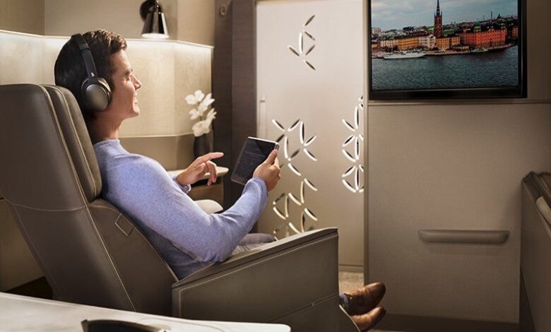 Obroke postrežejo v porcelanasti posodi na vaši zasebni jedilni mizi. Drsna vrata, elektronska zatemnitvena senčila in prava postelja – nič od tistega nižjega razreda, kjer sicer nabirate točke za prihodnje lete – dopolnjujejo preostanek leteče hotelske sobe.