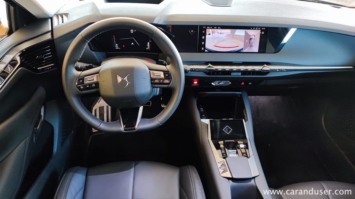 Kabina DS 4 je doživela digitalno revolucijo, fizičnih gumbov je le peščica, zasloni so kar trije. Za volanom se skrivajo digitalizirani merilniki, na sredini armaturne plošče je 10-palčni informacijski zaslon, katerega upravljamo s 5-palčno enoto na sredinski konzoli. Poimenovali so jo DS Smart Touch. Predstavili so še nov head-up prikazovalnik, z naprednim sistemom razširjene resničnosti, ki navigacijska navodila projicira na cesto štiri metre naprej, namesto na vetrobransko steklo. Elegantna notranjost bo lahko po željah strank odeta v kakovostno usnje ali alkantaro, z dekorativnimi elementi iz karbonskih vlaken ali naravnega lesa.
