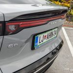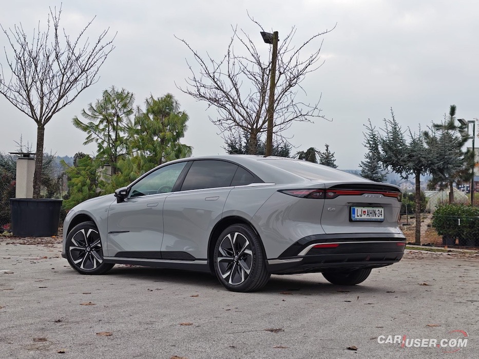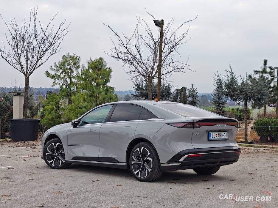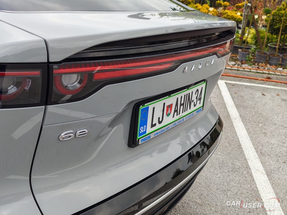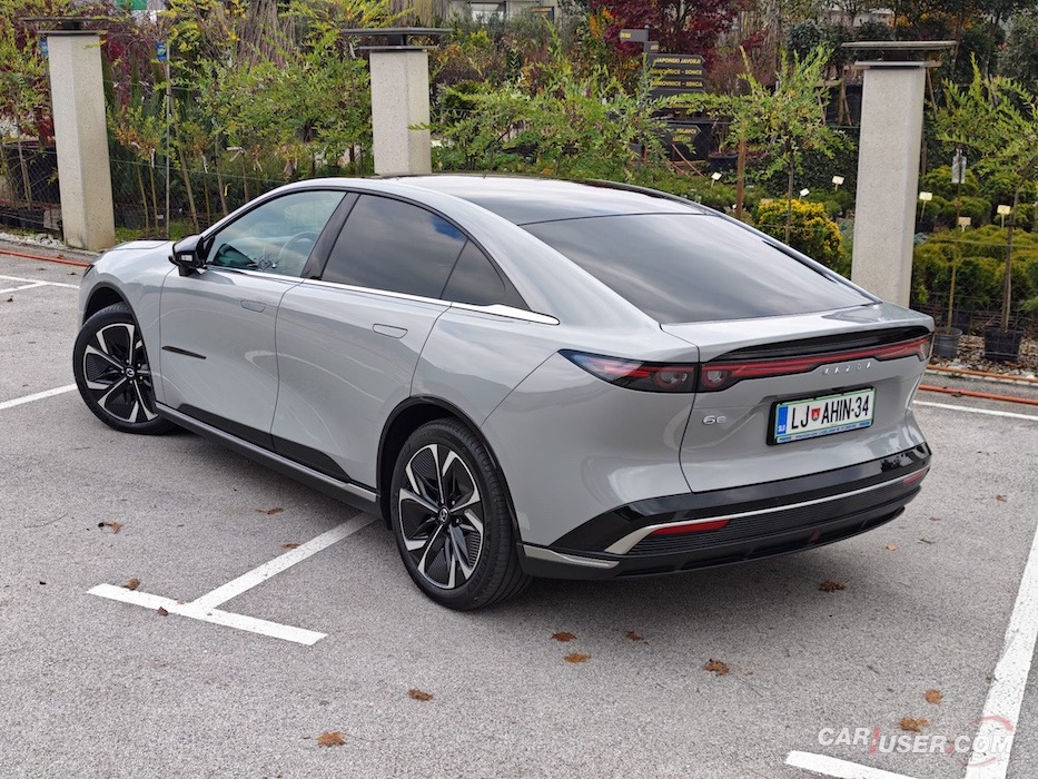 Oblikovanje 6e sledi temi avtentična sodobnost in združuje elegantno kupejevsko linijo z značilno moderno podobo električnega vozila. Limuzina z dolžino 4.921 mm, širino 1.890 mm, višino 1.491 mm in medosno razdaljo 2.895 mm, daje prednost preprostosti in udobju. Prtljažnik sprejme 466 litrov prtljage, polnilni kabli (dejansko zaradi lepo dodelanega prostora tudi brez težav torbe) pa bodo lahko shranjeni v 72-litrskem sprednjem prtljažniku. Z inteligentno uglašenim podvozjem in natančnim zavornim sistemom poskrbi za odlično dinamiko. Brezhibna povezava med voznikom in vozilom, znana kot Jinba Ittai ali “avto in voznik kot eno”, ustvarja resnično poglobljeno izkušnjo vožnje.