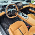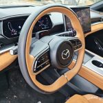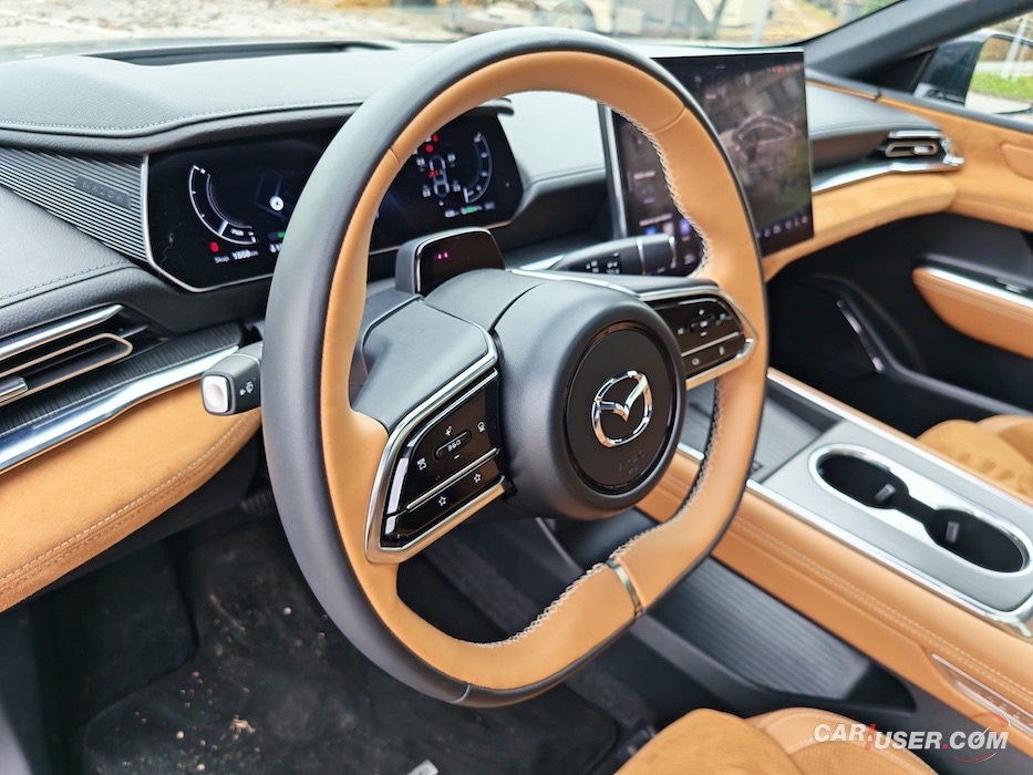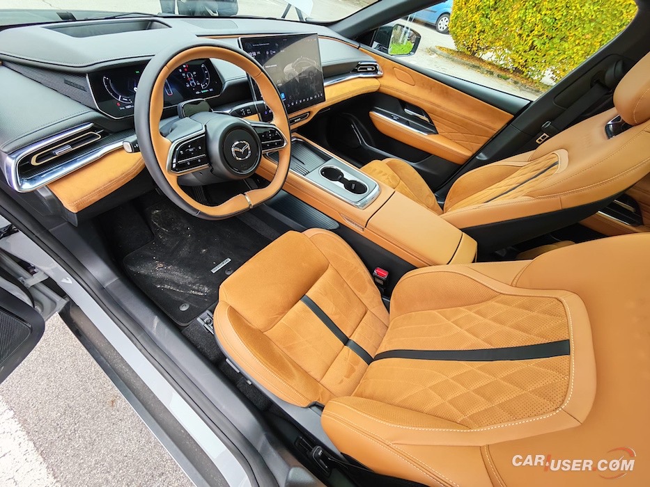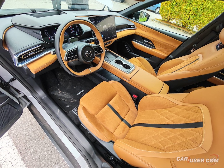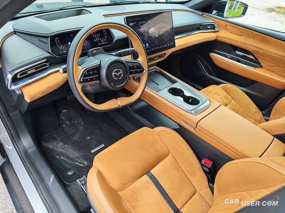 Notranjost kabine odraža Mazdino filozofijo Smart Cockpit: zasloni in upravljalni elementi so naravno razporejeni v voznikovem vidnem polju, da zmanjšajo motnje in izboljšajo reakcijski čas. Velik zaslon Head-Up Display projicira pomembne podatke o vožnji, kot so hitrost, navodila za navigacijo in varnostna opozorila, na vetrobransko steklo v optimalni razdalji 7,5 metra. Vozniki lahko prilagodijo količino prikazanih informacij v treh načinih – Minimal, Classic ali Custom – z dodatnim načinom Snow, ki spremeni barve zaslona, da izboljša berljivost na svetlem zimskem ozadju.