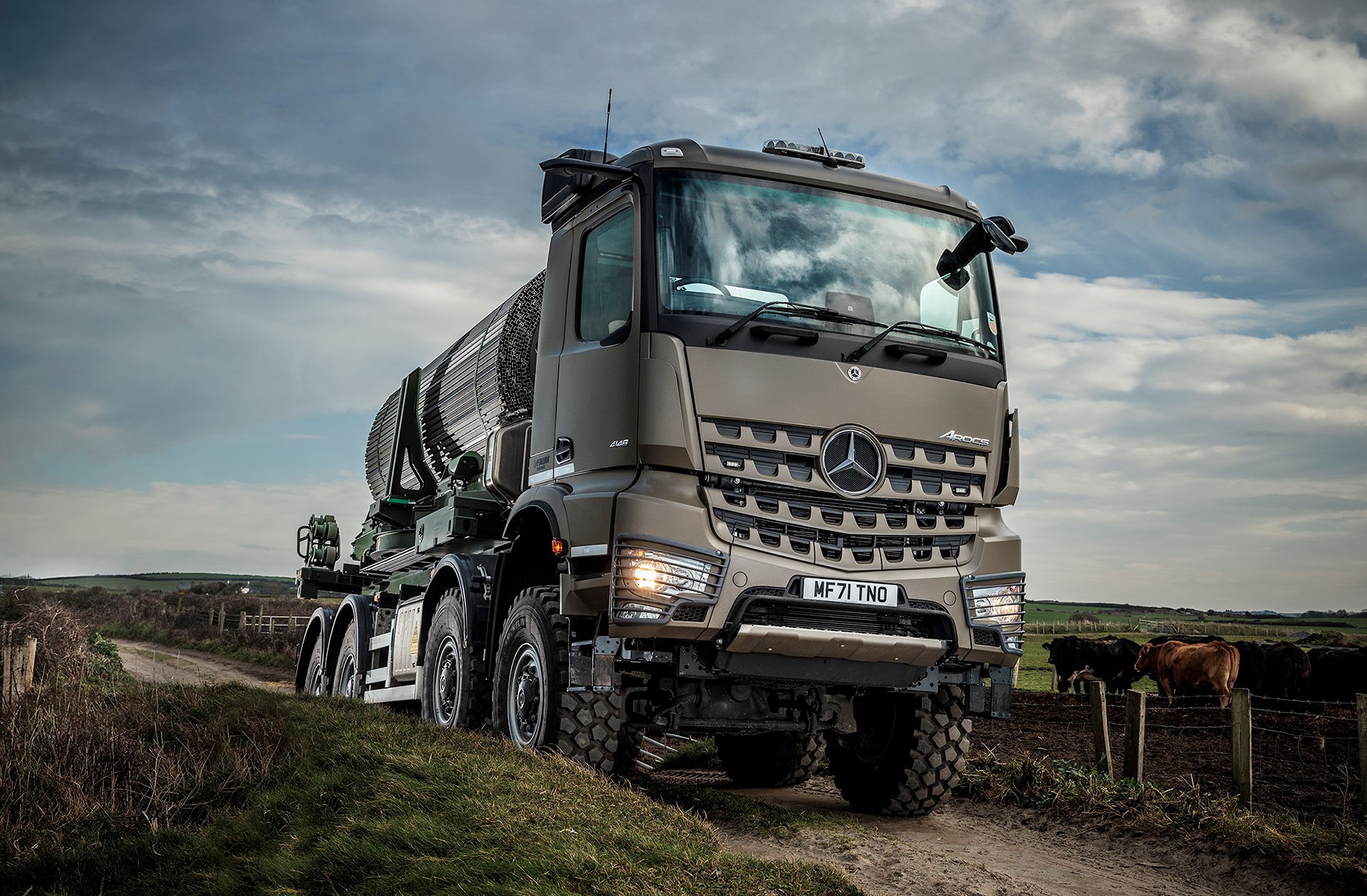 Zajetni tovornjak ima nameščen 12,8-litrski vrstni šestvaljnik s 350 kW (476 KM), ki vseh osem koles poganja preko 12-stopenjskega PowerShift 3 avtomatiziranega ročnega menjalnika. Pogon so iz klasičnega 8×4 pri posebnem oddelku Custom Tailored Trucks v Mercedes-Benzovi tovarni v francoskem Molseimu prelevili v vsekolesnega 8×8. Tako je nastal mogočni cestni orjak, ki bo brez večjega napora utrdil pot na terenu, kjer bi se potili tudi klasični in sposobni terenci. Kdo ve, morda si ga omislimo tudi na sončni strani Alp, da bomo lahko hitro zapeljali težko mehanizacijo na skoraj nedostopen teren, kot so recimo nedavno poplavljena območja.