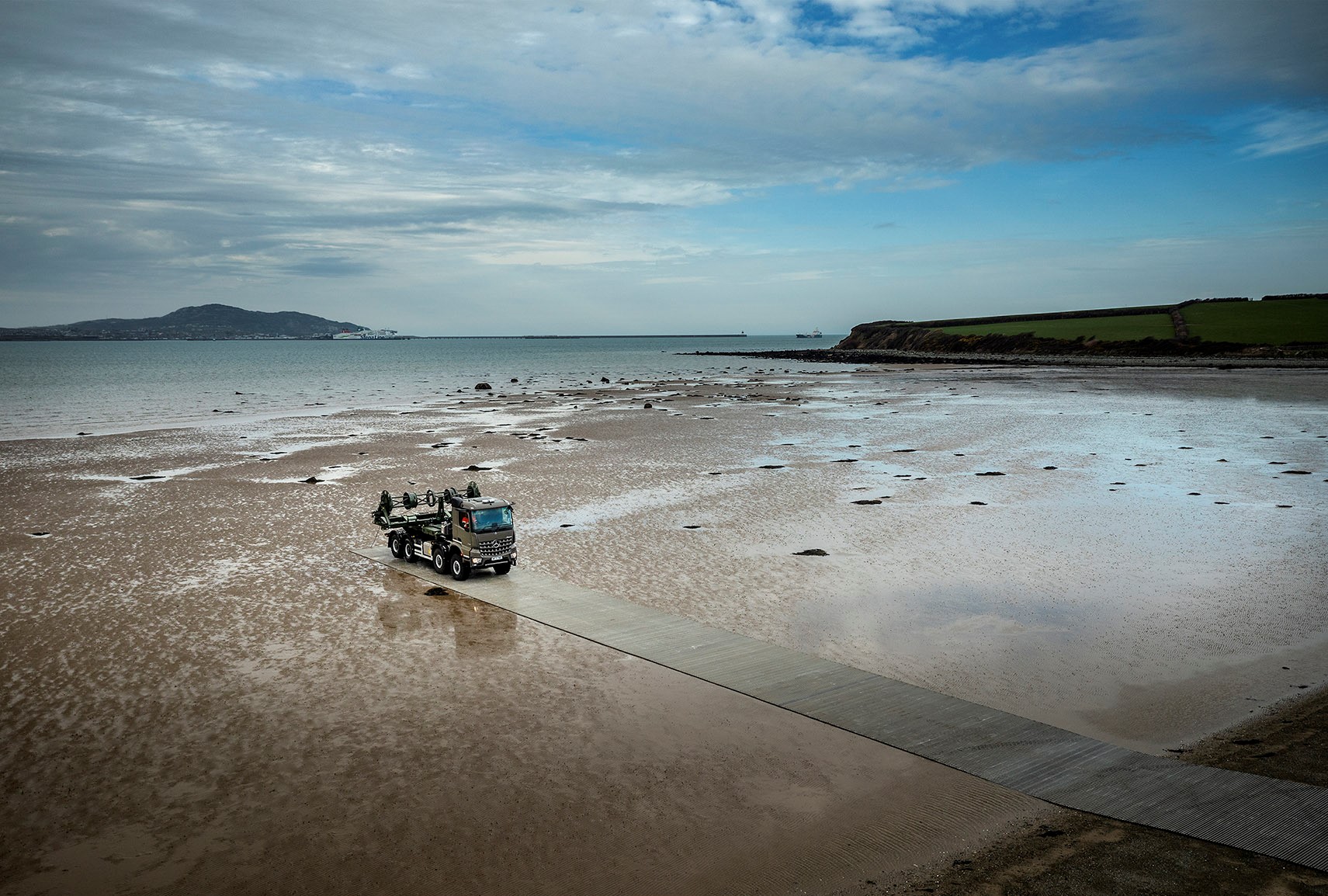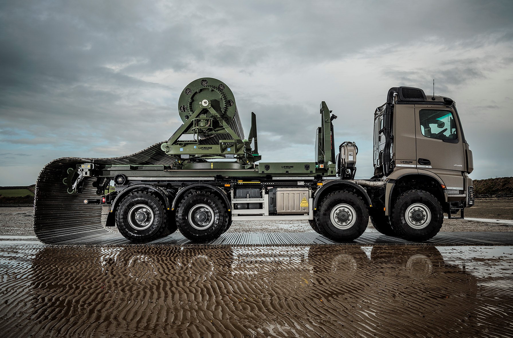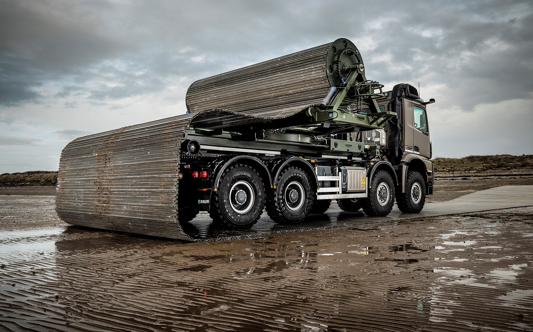 Eno je torej priprava tal za prevoz ali pristanek, povsem drugo pa je njihova dostava le-teh na teren. Da boste kar največ spravili najvišje oziroma najdlje, so se pri FAUN Trackwayju obrnili na Mercedes-Benz Trucks. Nemci so kot temelj vzeli svojega terensko naravnanega 8×8 Arocsa in ga zapeljali k Hiabu UK, globalnemu strokovnjaku za logistično in nakladalno opremo. Tam so Arocsa oplemenitili z zajetnim navijakom, na katerega spravite za 150 metrov dolgo pot aluminijastih panelov, s katerimi nato utrete pot preostalim. Seveda so mu dodali še kopico dodatne opreme, ki vozniku priskoči na pomoč pri prebijanju do cilja.