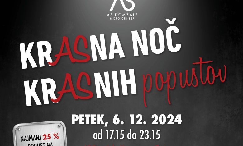 V petek, 6. decembra 2024, od 17.15 do 23.15 ure vas v AS Domžale Moto center vabijo, kjer bodo za vas pripravili nepozaben večer, poln izjemnih popustov, zabavnih aktivnosti in posebnih presenečenj.