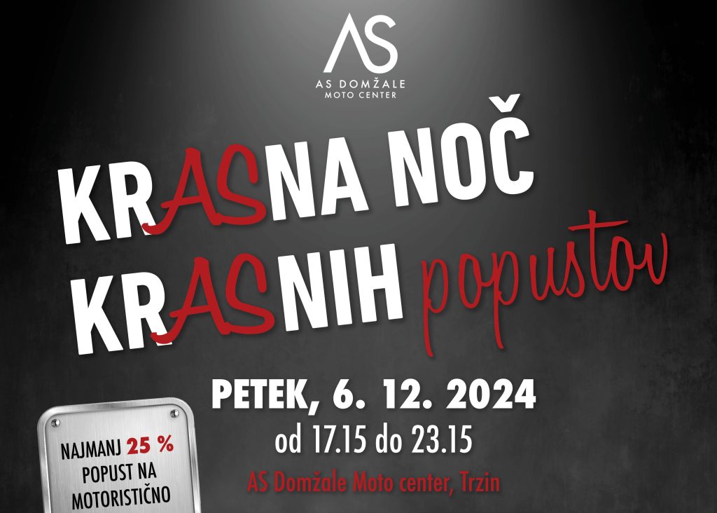 V petek, 6. decembra 2024, od 17.15 do 23.15 ure vas v AS Domžale Moto center vabijo, kjer bodo za vas pripravili nepozaben večer, poln izjemnih popustov, zabavnih aktivnosti in posebnih presenečenj.