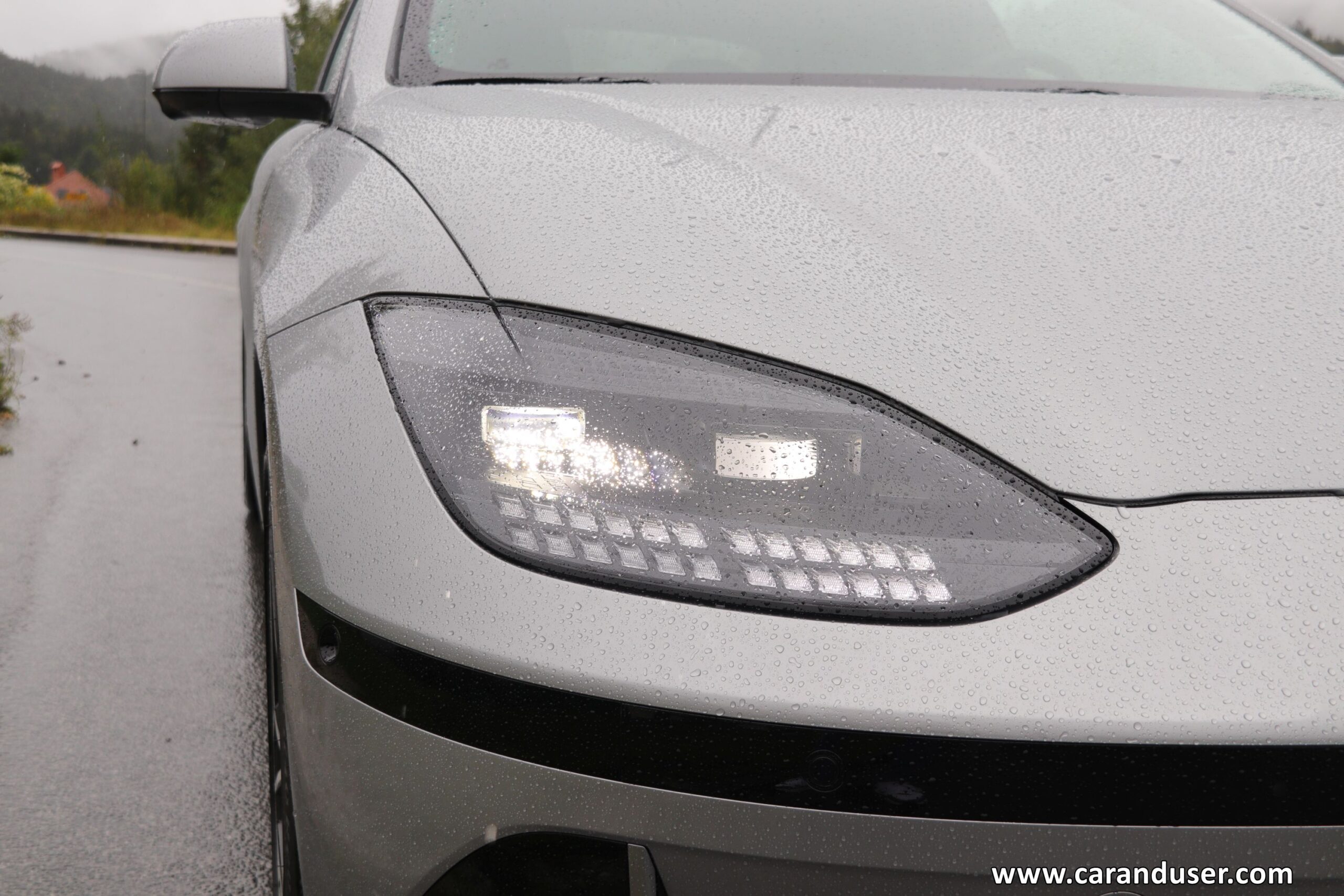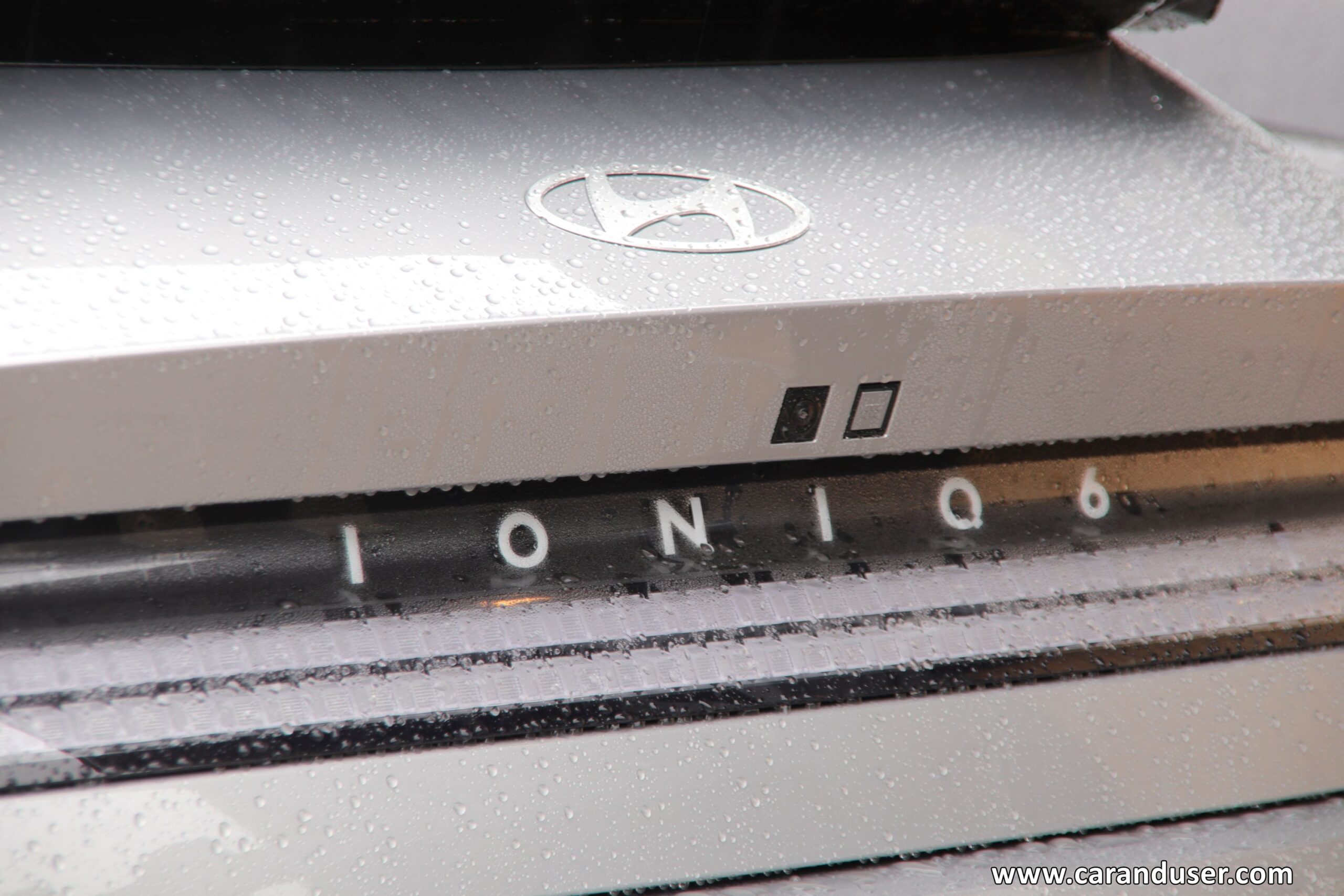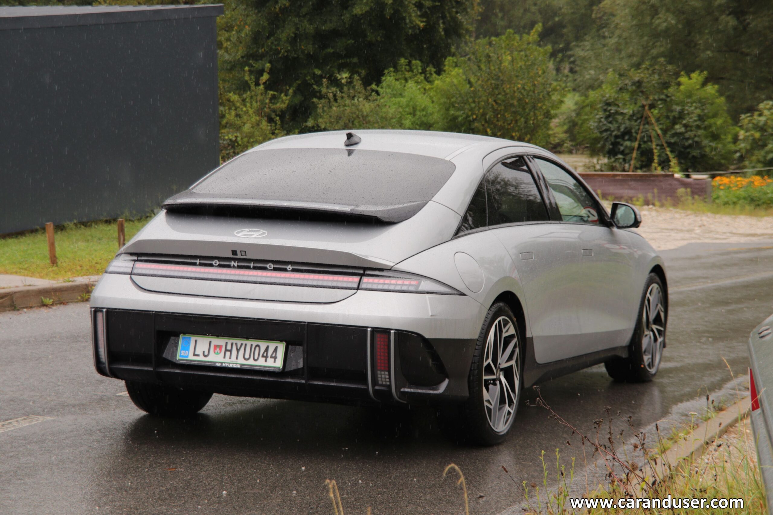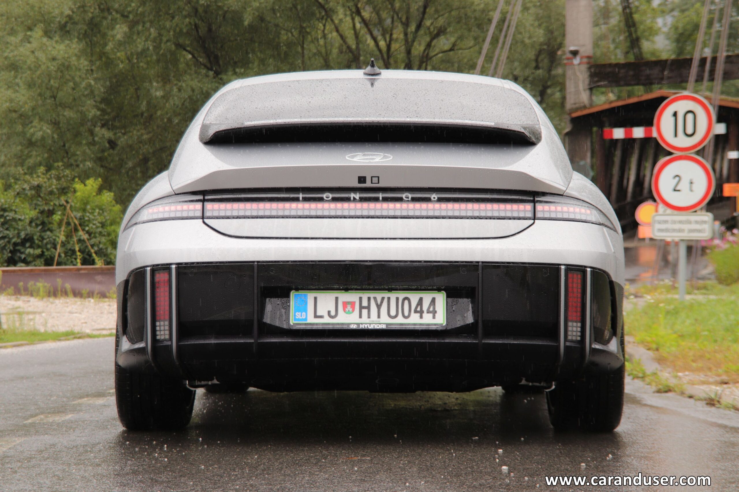 Zadek Ioniq 6 krasijo parametrične pikslase luči nameščene pod zadnjim krilcem, ki se raztezajo čez celotno širino zadka. Najdemo jih tudi na sprednjem delu v omejenem številu na dnu obeh žarometov, obenem sprednji del pretkano skriva celo zbirko varnostnih senzorjev v tankem črnem elementu sredi odbijača. Krivine novega Hyundaija malenkost spominjajo na Porscheja 911 in Audija TT, ustvarjalci pa poudarjajo, da niso želeli ustvariti tipične limuzine, temveč štirivraten avtomobil z uporabnim prtljažnikom ter kupejevskimi linijami. V prtljažniku je namreč dovolj prostora za 401 litrov prtljage, dodaten sprednji prtljažnik »frunk« nudi 45 litrov prostora.