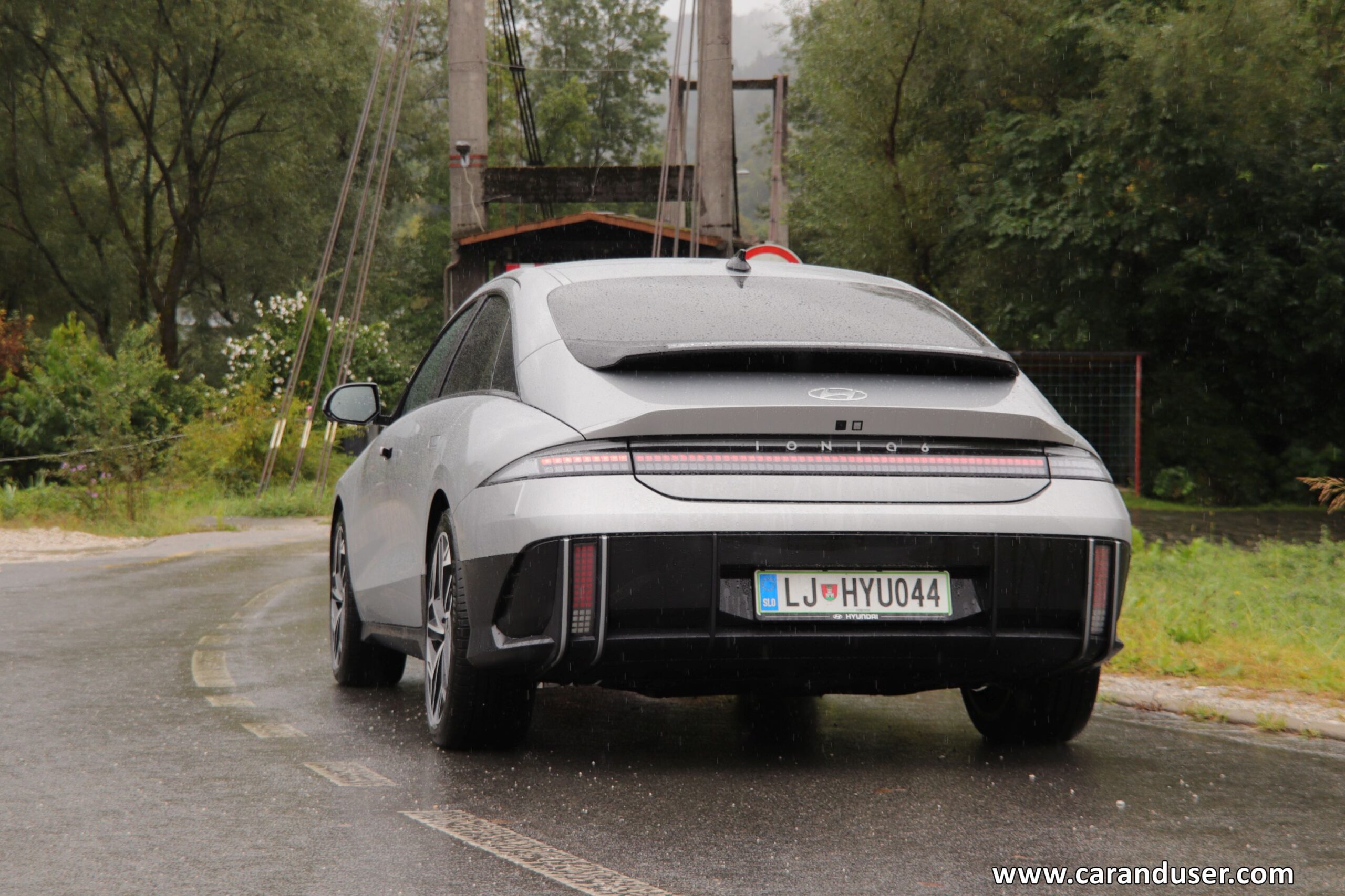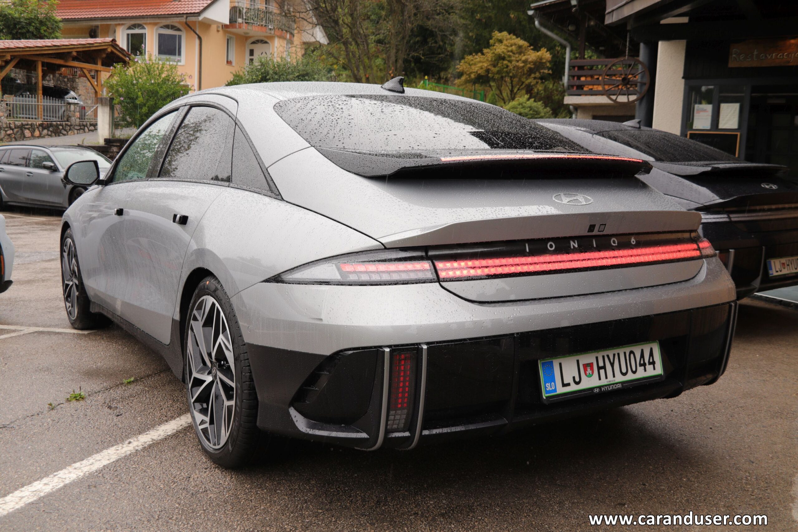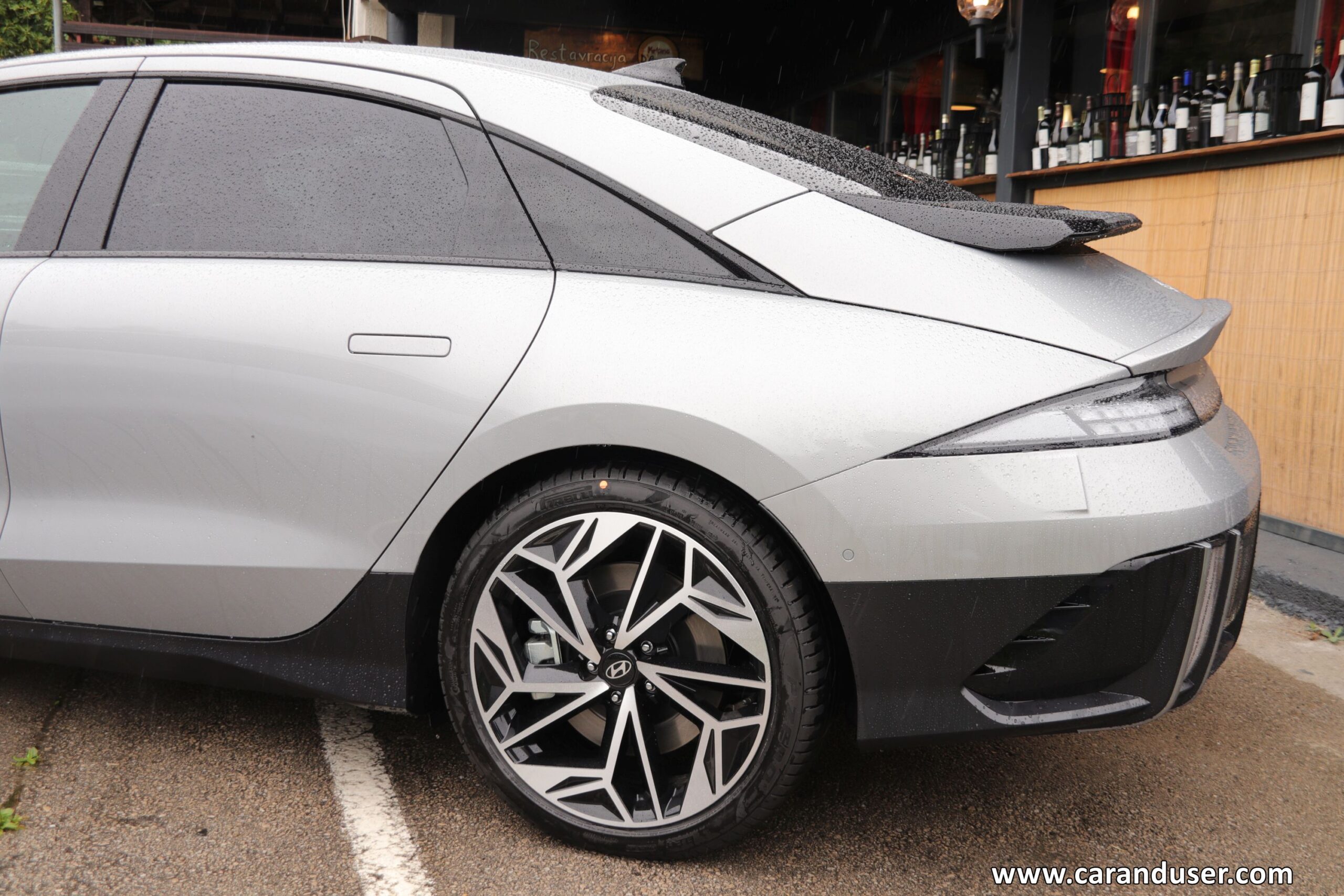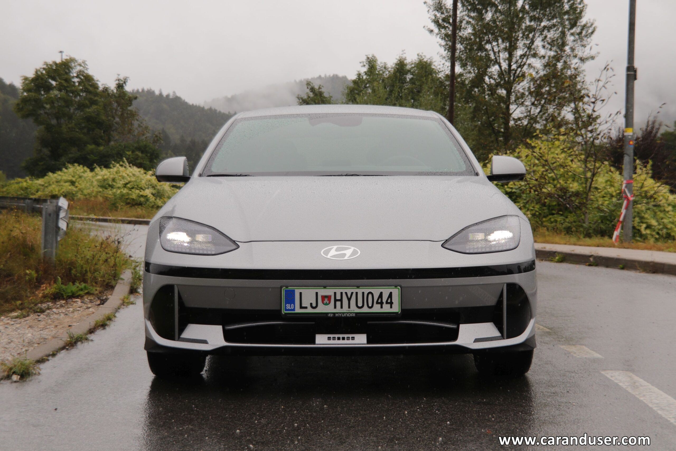 Zadek Ioniq 6 krasijo parametrične pikslase luči nameščene pod zadnjim krilcem, ki se raztezajo čez celotno širino zadka. Najdemo jih tudi na sprednjem delu v omejenem številu na dnu obeh žarometov, obenem sprednji del pretkano skriva celo zbirko varnostnih senzorjev v tankem črnem elementu sredi odbijača. Krivine novega Hyundaija malenkost spominjajo na Porscheja 911 in Audija TT, ustvarjalci pa poudarjajo, da niso želeli ustvariti tipične limuzine, temveč štirivraten avtomobil z uporabnim prtljažnikom ter kupejevskimi linijami. V prtljažniku je namreč dovolj prostora za 401 litrov prtljage, dodaten sprednji prtljažnik »frunk« nudi 45 litrov prostora.