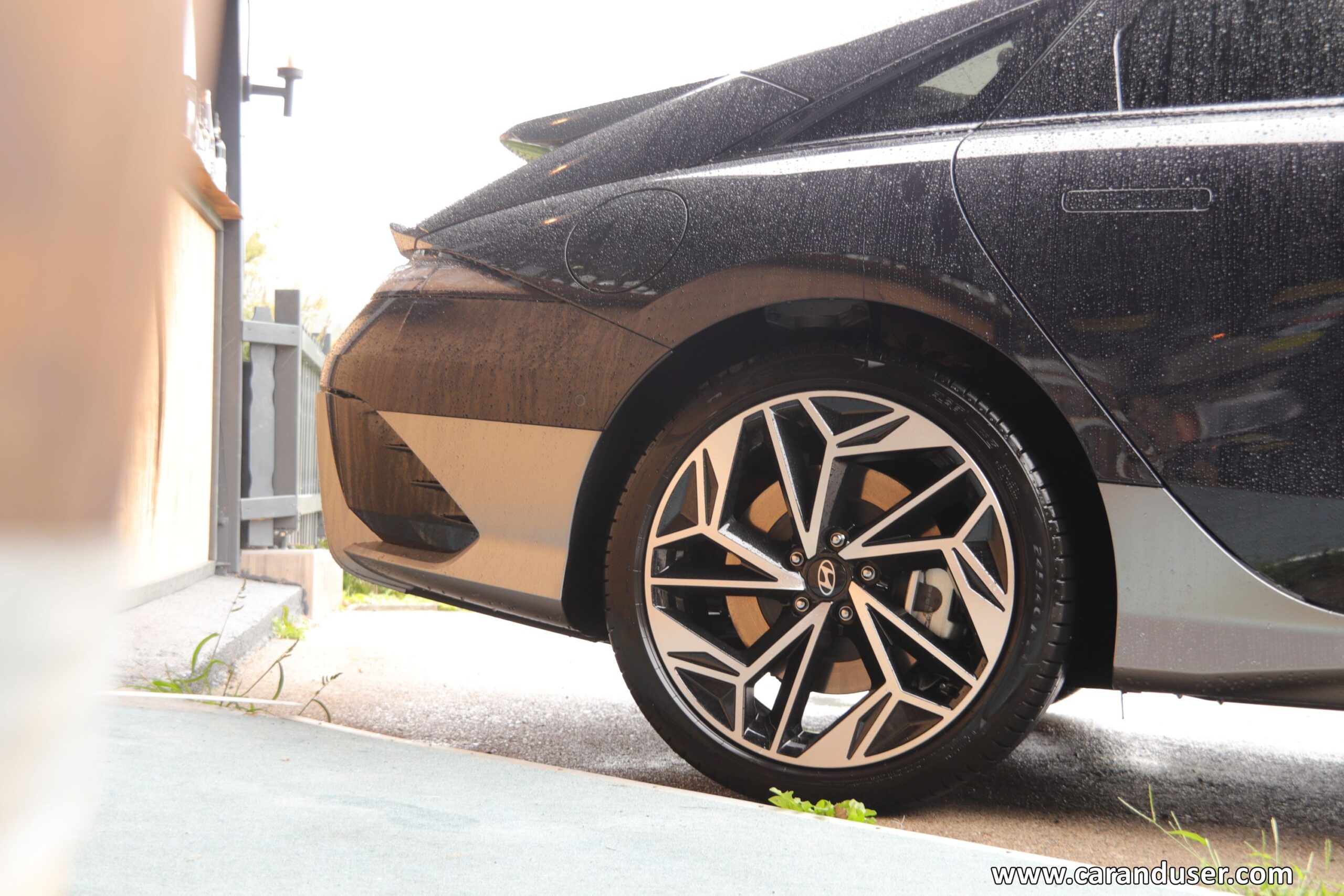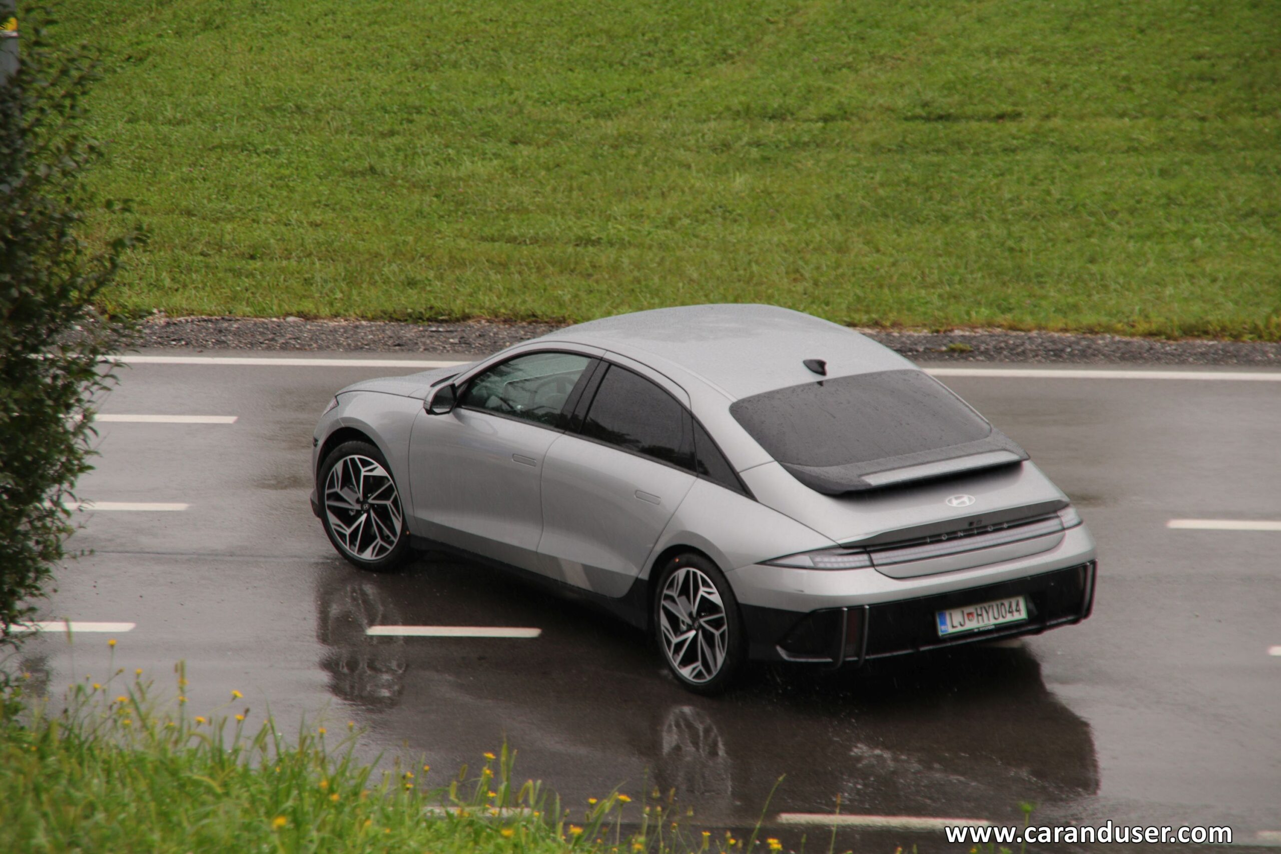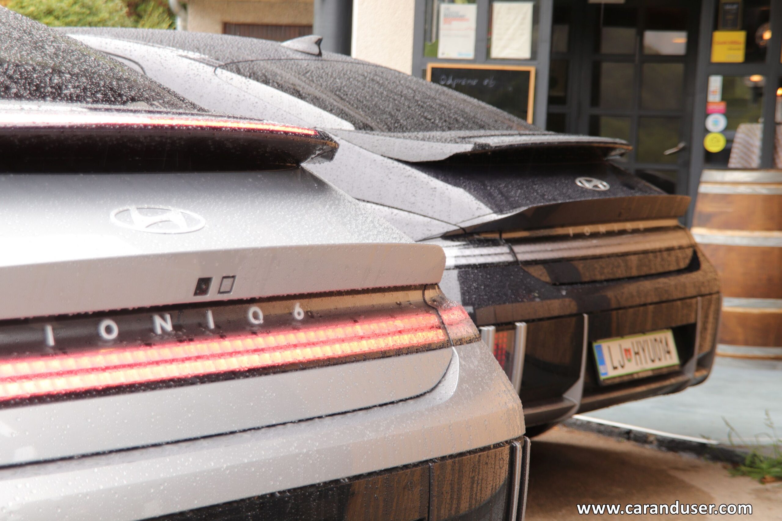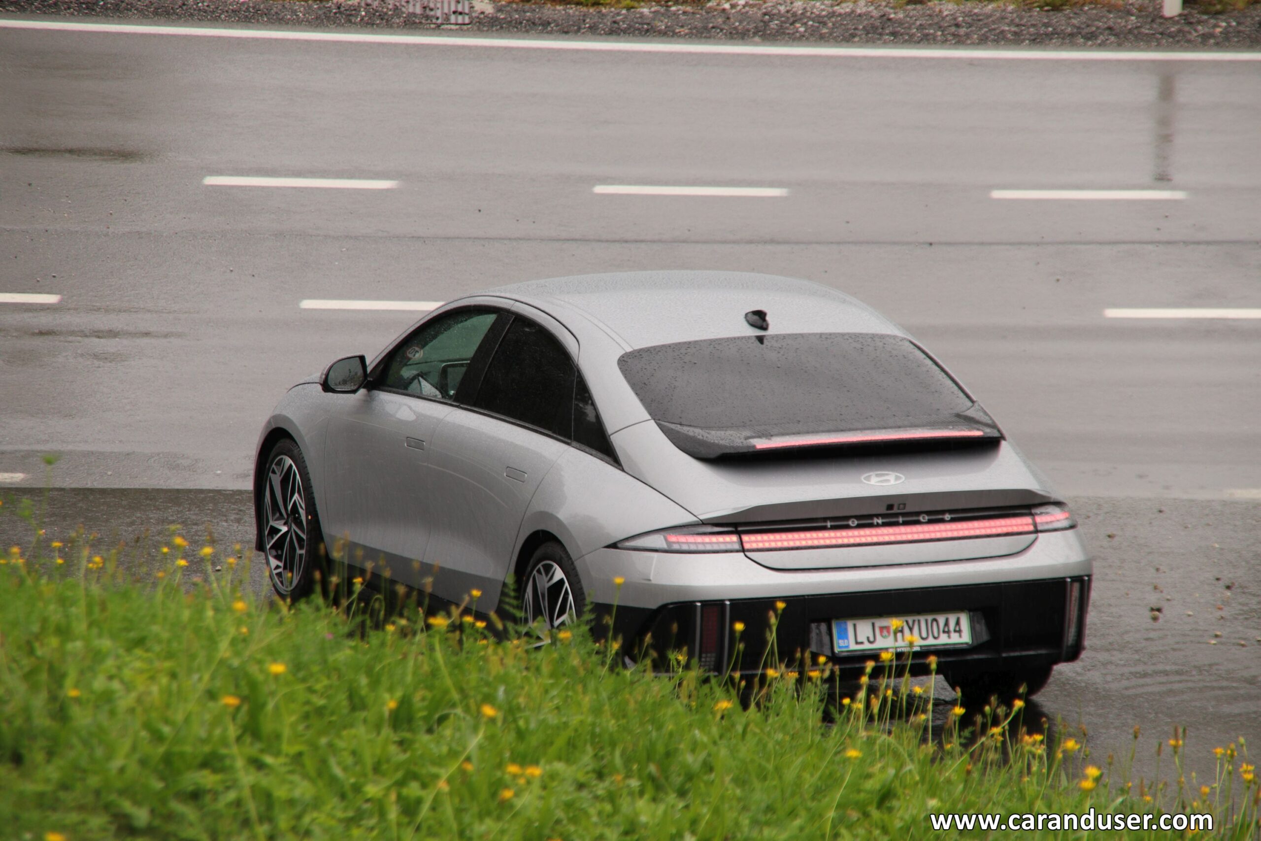 Zadek Ioniq 6 krasijo parametrične pikslase luči nameščene pod zadnjim krilcem, ki se raztezajo čez celotno širino zadka. Najdemo jih tudi na sprednjem delu v omejenem številu na dnu obeh žarometov, obenem sprednji del pretkano skriva celo zbirko varnostnih senzorjev v tankem črnem elementu sredi odbijača. Krivine novega Hyundaija malenkost spominjajo na Porscheja 911 in Audija TT, ustvarjalci pa poudarjajo, da niso želeli ustvariti tipične limuzine, temveč štirivraten avtomobil z uporabnim prtljažnikom ter kupejevskimi linijami. V prtljažniku je namreč dovolj prostora za 401 litrov prtljage, dodaten sprednji prtljažnik »frunk« nudi 45 litrov prostora.