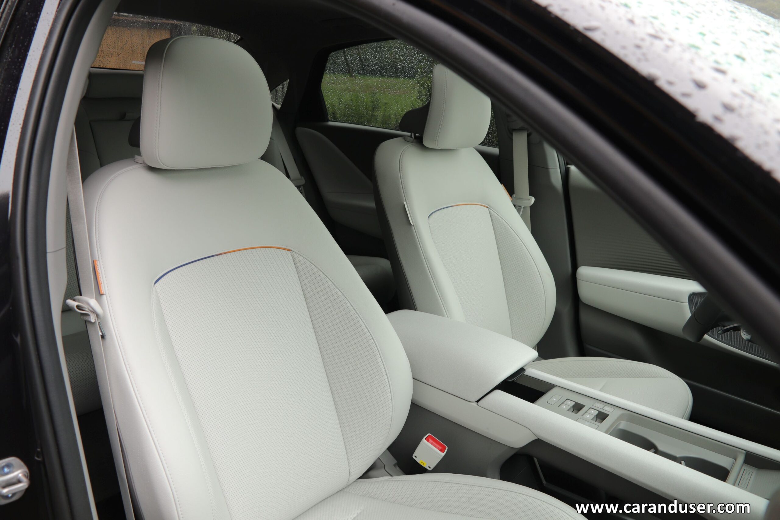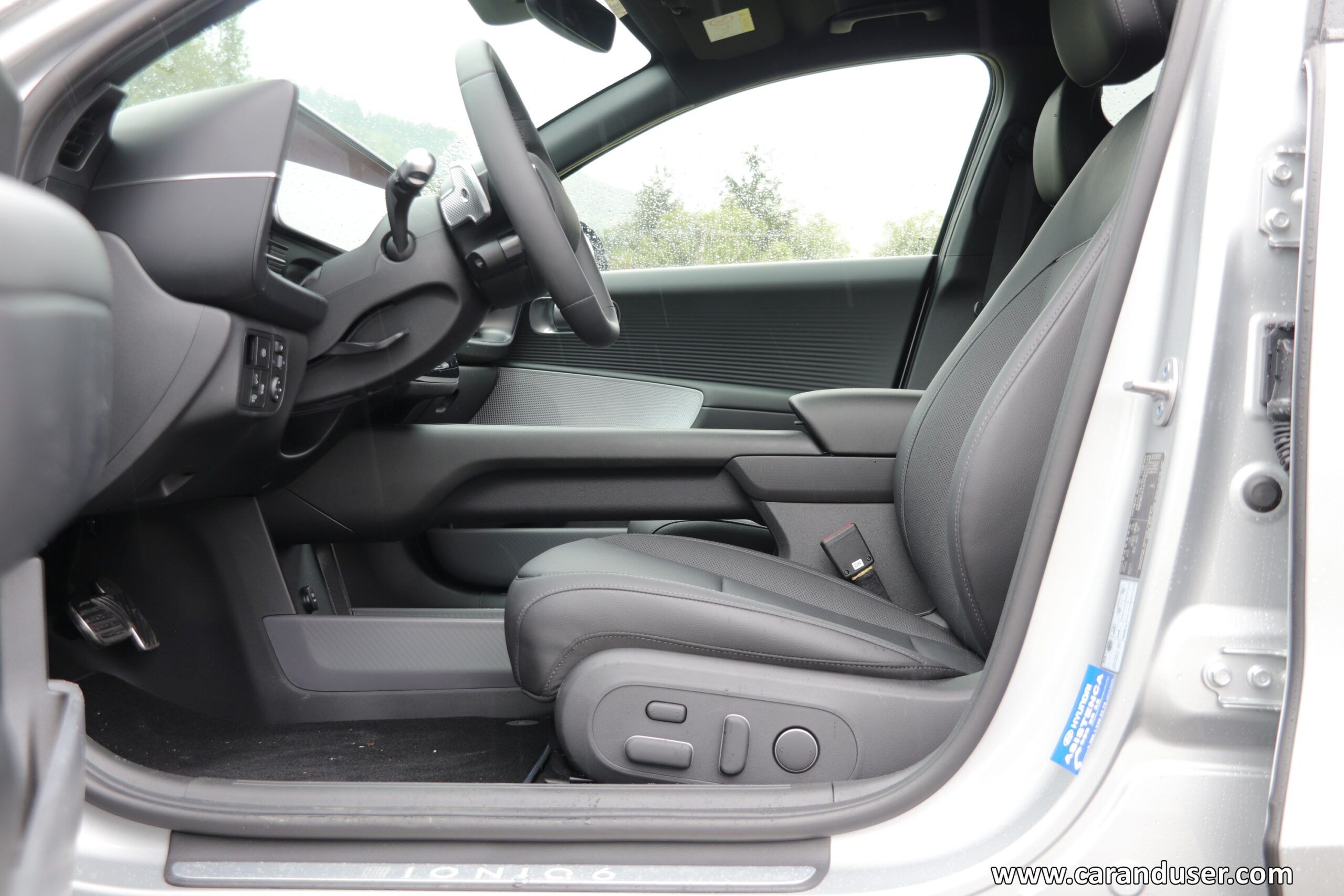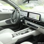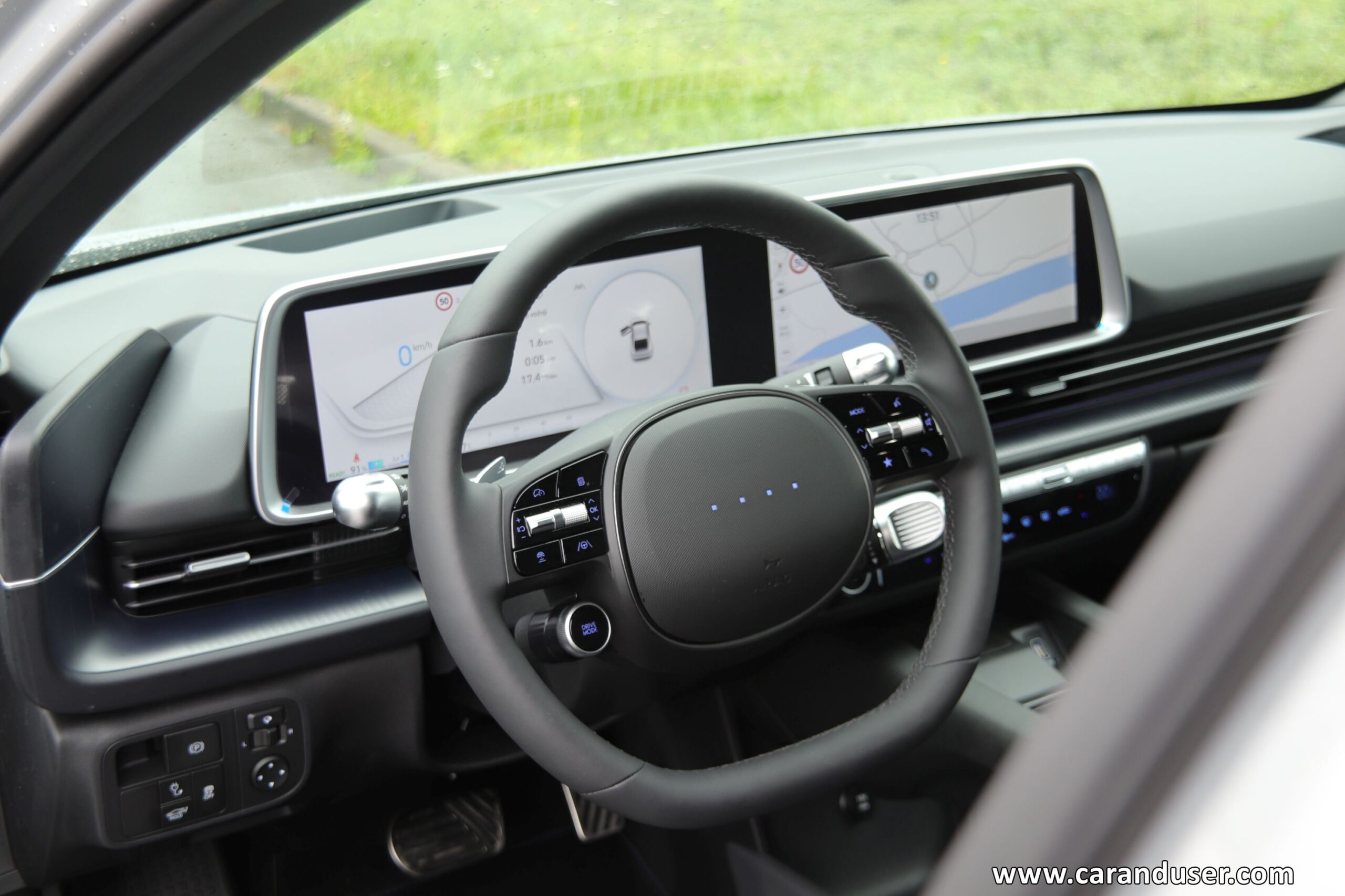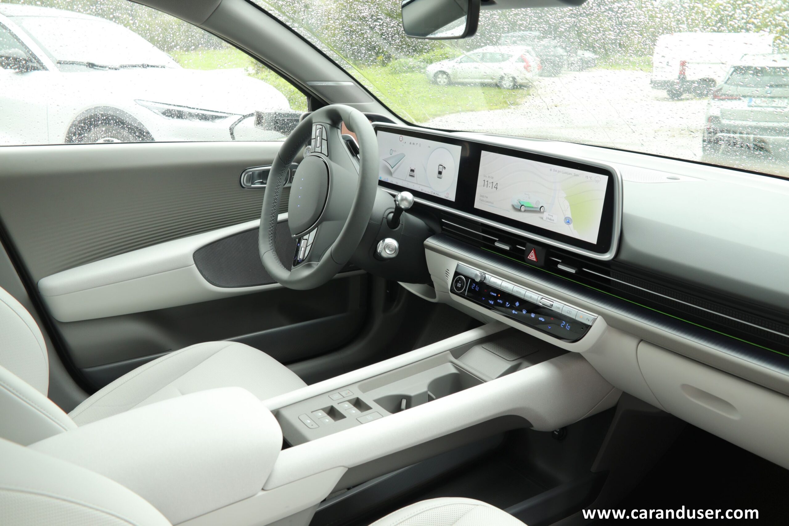 Preprostost in eleganca se nadaljujeta v notranjosti, s panoramskim panelom na armaturni plošči, ki združuje dva 12,3-palčna zaslona – osrednjega za prikazovanje informacijsko-zabavnih vsebin in levega za prikaz merilnikov in podatkov vožnje. Operacijski sistem opremljen z najnovejšo generacijo Bluelinka je povezljiv s storitvama Apple CarPlay in Android Auto, nov je inteligentni načrtovalnik poti glede na stanje baterije, uporabnikom je namenjeni 5 USB priklopov in možnost izbire projicirnega zaslona. V notranjosti so ravne in uporabne površine, obogatene z 64-barvno ambientno osvetlitvijo, z volana so odstranili logotip znamke, prazno mesto pa nadomestili z LED svetilnimi elementi, ki se odzivajo na prepoznavanje glasu in prikazujejo stopnjo napolnjenosti baterije.