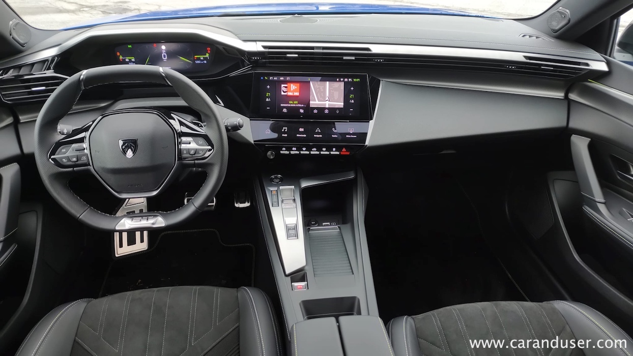 Kabina novega 308 sledi trenutnim smernicam podjetja z digitaliziranim 10-palčnim i-Cockpit voznikovim okoljem. Dodaten sredinski informacijski zaslon na dotik prav tako meri 10-palcev, pod njim se nahajajo gumbi bližnjic, s prilagodljivimi funkcijami. Edina pomanjkljivost je izguba hitrih fizičnih gumbov za upravljanje klimatske naprave. Drugod lahko pohvalimo še povečanje notranjega prostora, podaljšanje medosja posledično zadnjim potnikom ponuja več udobja, vsi odlagalni prostorčki po kabini skupaj znesejo presenetljivih 34 litrov prostornine.