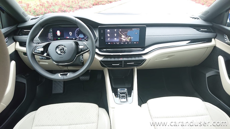 Če so zunanje linije morda vsaj delno pričakovane, pa je ve? (r)evolucije ob vstopu v notranjost. Tam nas pričakuje sodobnejši in elegantnejši ambient, ki ga tvorijo pokončno postavljen osrednji zaslon velikosti od 8,25 do 10 palcev, voznikovi digitalni merilniki ter nova stikala v obliki drsnikov. Nova je tudi prestavna ročica samodejnega DSG menjalnika, ki je bistveno manjša. Razlog je v opustitvi mehanske povezave med ročico in menjalnikom, kar smo videli tudi ob predstavitvi novega VW Golfa. Med novosti sodi še dvokrak volanski obroč, nad digitalnimi voznikovimi merilniki pa se nahaja projicirni head-up zaslon. Vsled sodobnejših elementov Octavia deluje še bolj zrelo in elegantno kot smo je bili morda vajeni do sedaj.