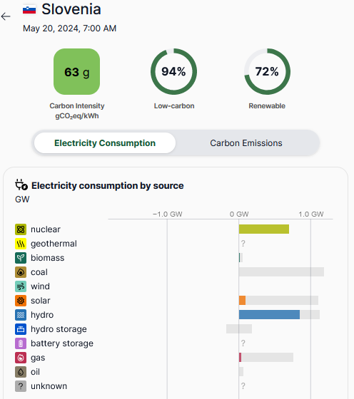 Zaradi prevladujoče proizvodnje iz NEK, hidroelektrarn in sončnih elektrarn je trenutna vrednost nizka in znaša le 63 g CO2 na proizvedeno kWh. V Nemčiji recimo v tem istem trenutku pregleda znaša kar 329 g/kWh, na Poljskem pa z 793 g/kWh daleč največ v Evropski uniji. Med najboljšima sta Francija s 17 g/kWh in le gram višje Švedska.