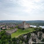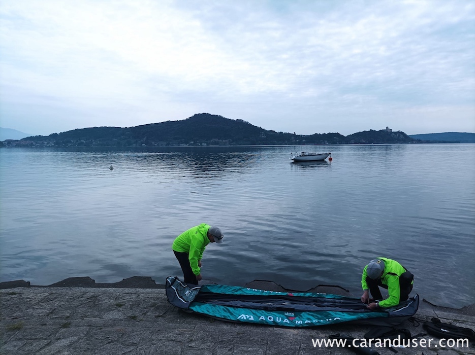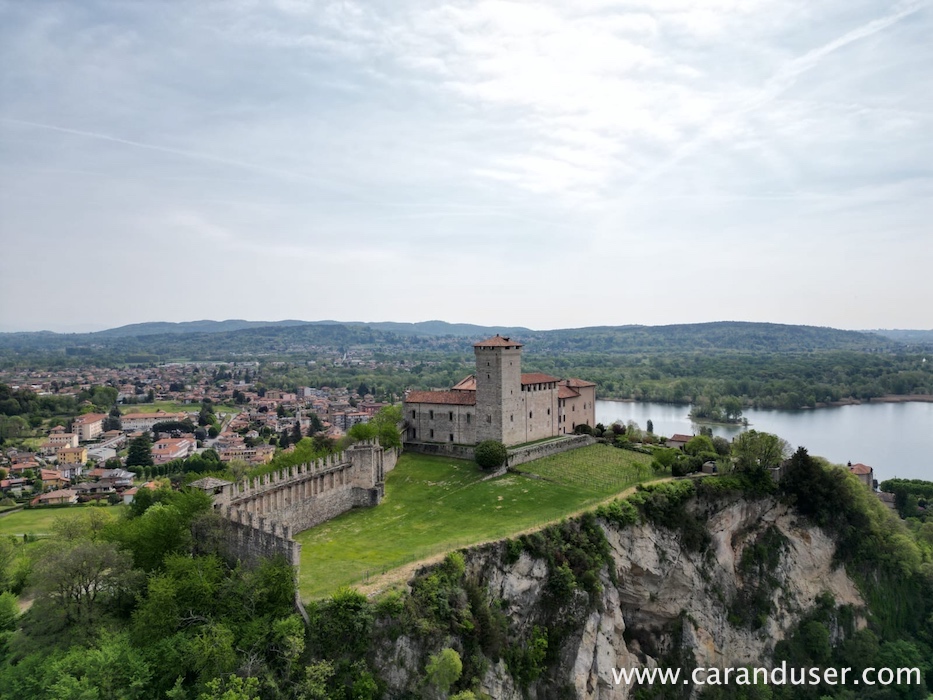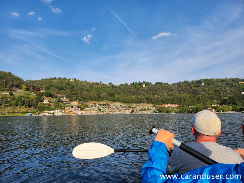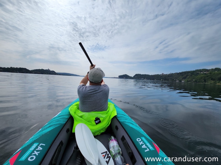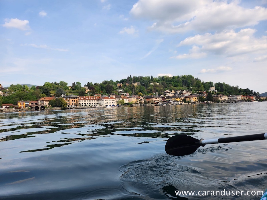 S seboj smo vzeli tudi napihljiv kajak Aqua Marina Laxo, ki je bil nekako tudi razlog za začrtano pot. V dopoldanskih urah smo se povsem brez kakršnega koli stresa odpravili proti jezeru Maggiore. Italijanska ledeniška jezera so zares impresivna in ponujajo prečudovito kuliso. No, iz Milana boste do jezera Maggiore potrebovali slabo uro, potem pa je odločitev na vas, kje se želite izkrcati. S kolegom sva na drugi strani brega (približno 2-3 kilometra) zagledala čudovito ruševino na pečini in se odločila, da do tja kar odveslava. Voda v jezeru Maggiore ni ravno za hvalisanje, predvsem pa imajo Italijani na njihovih jezerih nek poseben fetiš, da gliserjem iztiskajo dušo iz motorja. In ko ste sami na jezeru v napihljivem kajaku pogosto le upate, da vas je objestni testeninar ujel v svoj fokus. S kolegom sva imela res smolo, da so se valovi čolnov okrepili ravno takrat, ko sva prispela na brežino druge strani – bil je moker do gat! Nekaj sebkov na drugi strani, hitro sušenje gat in veselo nazaj čez jezero. Po sredini jezera poteka meja med pokrajinama Piemont in Lombardija.