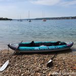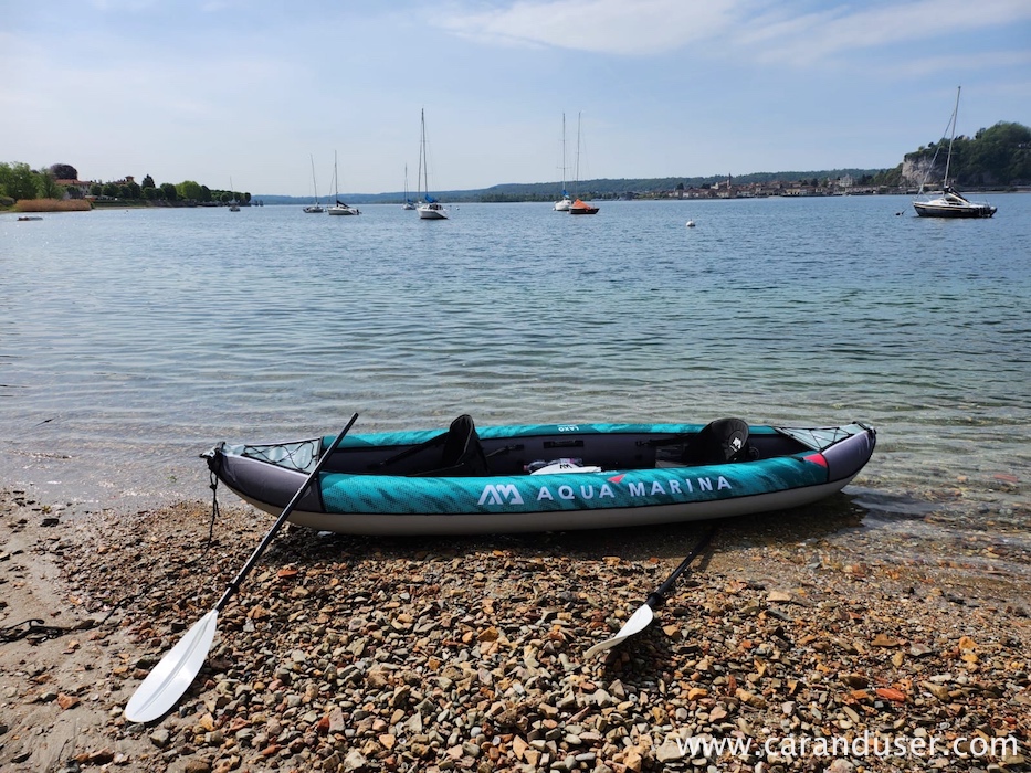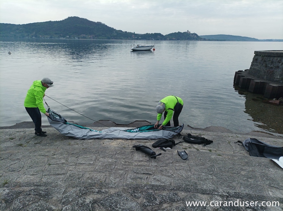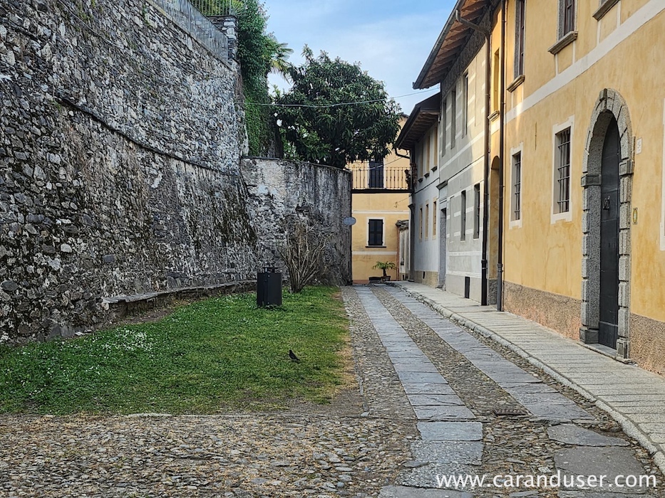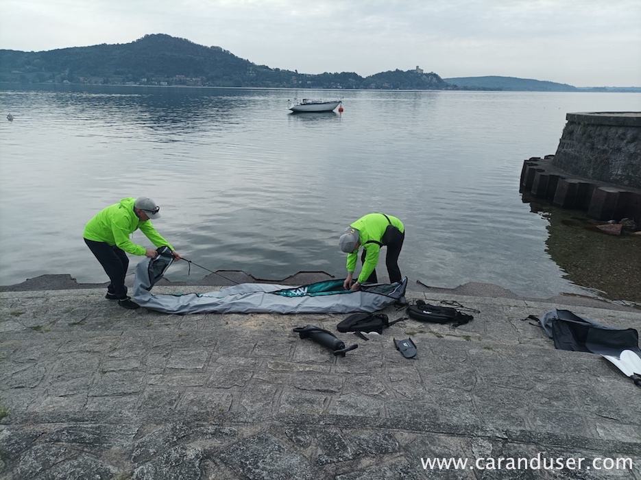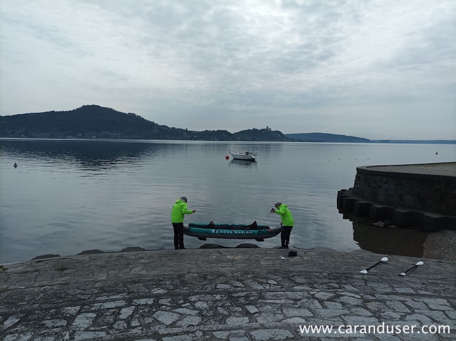 S seboj smo vzeli tudi napihljiv kajak Aqua Marina Laxo, ki je bil nekako tudi razlog za začrtano pot. V dopoldanskih urah smo se povsem brez kakršnega koli stresa odpravili proti jezeru Maggiore. Italijanska ledeniška jezera so zares impresivna in ponujajo prečudovito kuliso. No, iz Milana boste do jezera Maggiore potrebovali slabo uro, potem pa je odločitev na vas, kje se želite izkrcati. S kolegom sva na drugi strani brega (približno 2-3 kilometra) zagledala čudovito ruševino na pečini in se odločila, da do tja kar odveslava. Voda v jezeru Maggiore ni ravno za hvalisanje, predvsem pa imajo Italijani na njihovih jezerih nek poseben fetiš, da gliserjem iztiskajo dušo iz motorja. In ko ste sami na jezeru v napihljivem kajaku pogosto le upate, da vas je objestni testeninar ujel v svoj fokus. S kolegom sva imela res smolo, da so se valovi čolnov okrepili ravno takrat, ko sva prispela na brežino druge strani – bil je moker do gat! Nekaj sebkov na drugi strani, hitro sušenje gat in veselo nazaj čez jezero. Po sredini jezera poteka meja med pokrajinama Piemont in Lombardija.