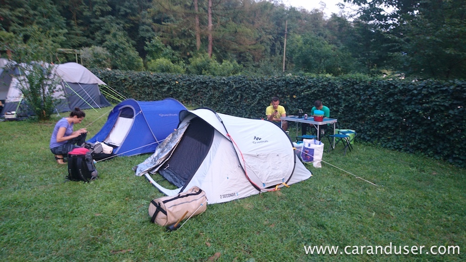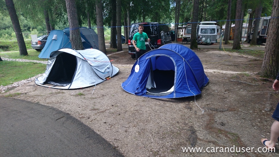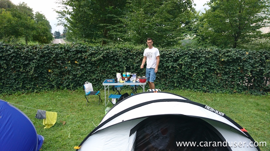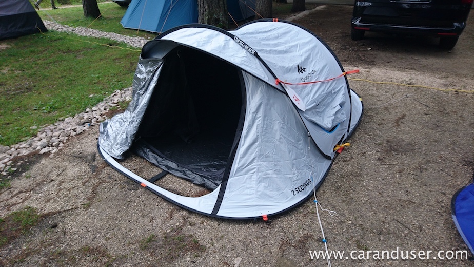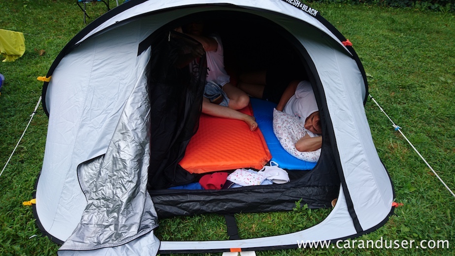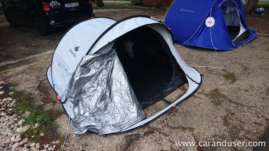 To leto se je del uredništva caranduser.com odpravil po Evropi. S šotorom! Priznam, kar nekoliko tesnobe je bilo prisotne na začetku. Devetkrat bomo prenočevali! Toda, že prva noč je postregla z optimizmom. Čemu? Quechua Fresh & Black! Šotori, ki jih vržete v zrak in se postavijo v dveh sekundah seveda niso novost, je pa novost model Fresh & Black. Vreča v katero zložite šotor, meri slabih 80 centimetrov, v njej pa boste našli vse od vrvic, klinov in seveda šotora. Po izkušnjah boste za postavitev šotora potrebovali največ minuto in v resnici to početje ne predstavlja nikakršnega napora. Mi smo imeli izvedenko za tri osebe (210×185; višina 101 centimeter), pri čemer se trije odrasli moški nismo počutili kot konzervirane sardele. Nov model obljublja veliko. Predvsem to, da bo v njem bistveno hladneje kot običajnih šotorih. In res je.