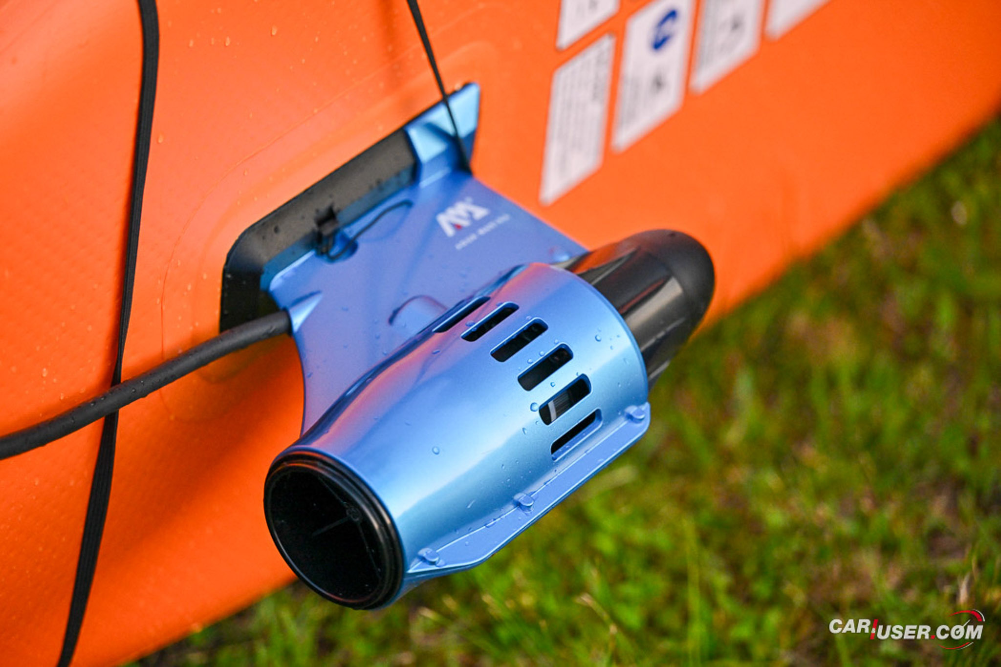 Ker je nastavek za pritrditev motorja univerzalen (vsaj kar se tiče plovil Aqua Marina), lahko slednjega namestite tudi na kajake oziroma kanuje. Mi smo ga denimo na našega Laxa in se je izkazal za sila uporabnega sopotnika. V smeri proti toku je bil četrti veslač, ko je baterija opravila svoje, pa je čoln nazaj šel s tokom, za trojico veslačev pa tudi ni bilo skrbi, da ne bi prispeli do štarta izplutja.