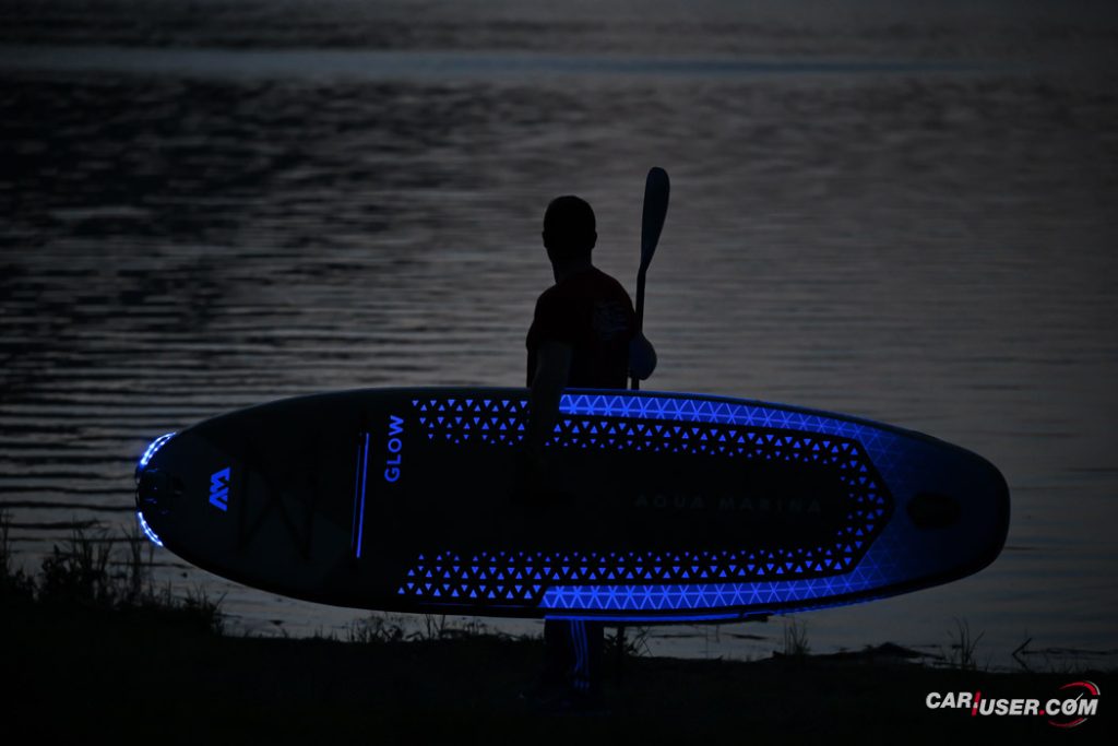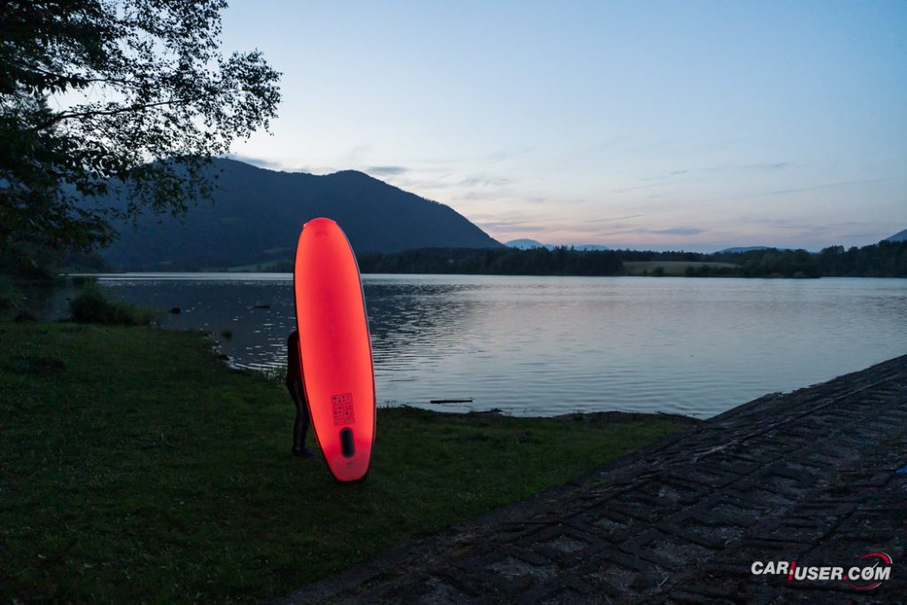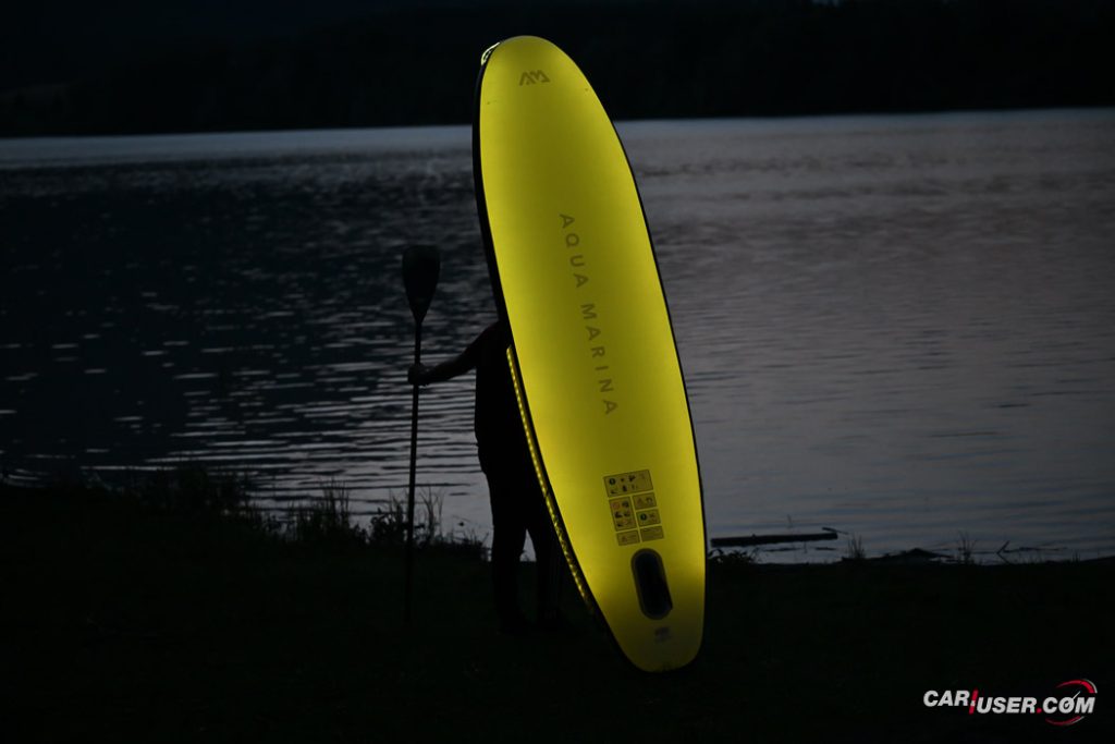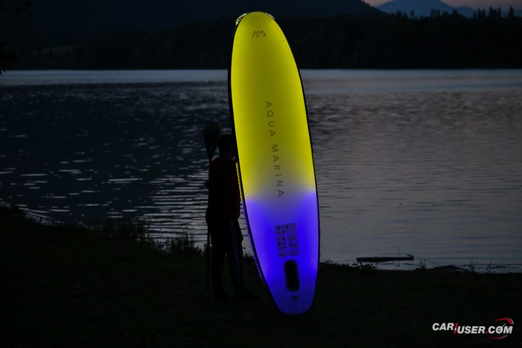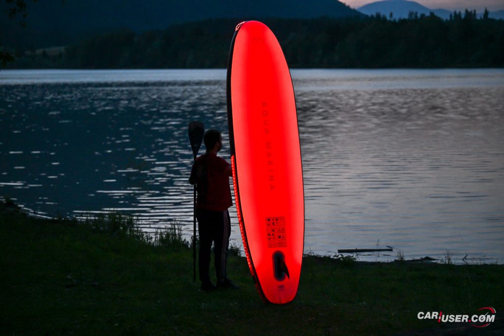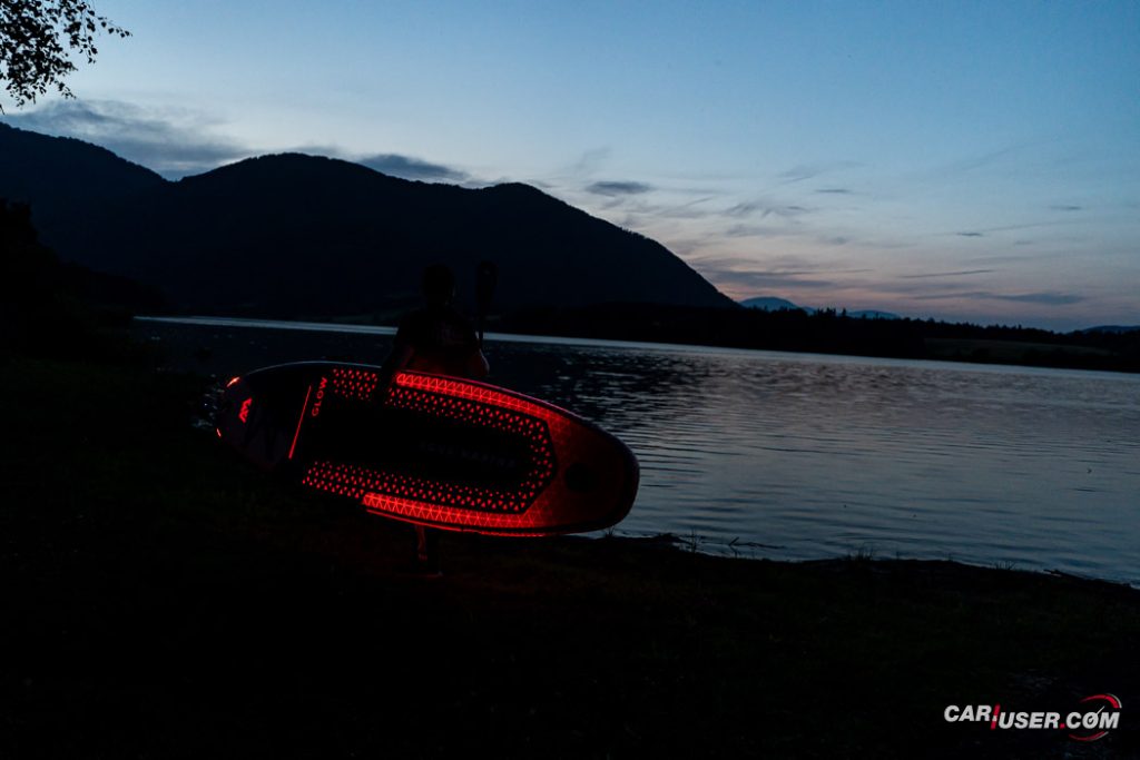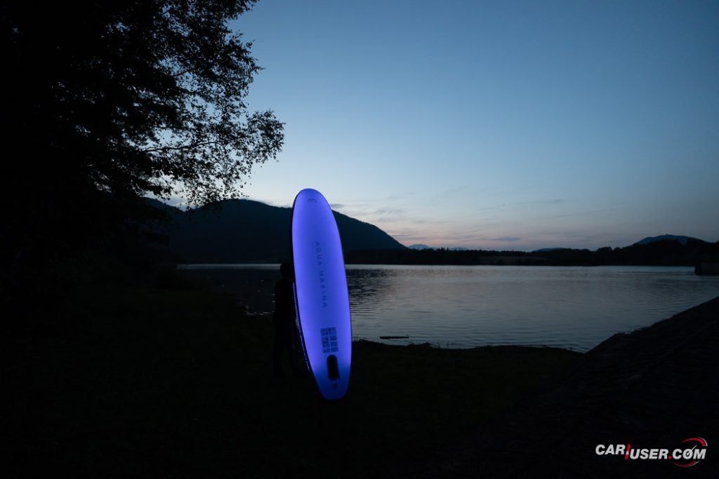 Ko smo Glowa preizkusili pri dnevni svetlobi, je bila to povsem običajna SUP-deska, čigar nosilnost je omejena s 140 kilogrami, v dolžino pa meri 315 centimetrov (D x Š x V: 315x 79 x 15 cm). Zaradi dolžine deske, je slednja prvenstveno namenjena predvsem enemu uporabniku, uporabiti pa jo moč tako na mirnih kot nekoliko bolj valovitih vodah. Toda, ko se je začelo mračiti …