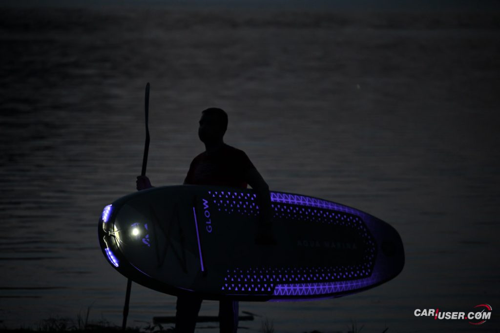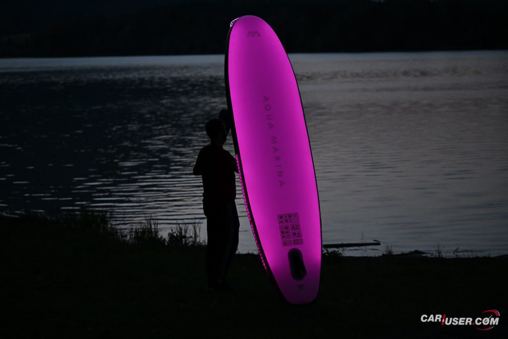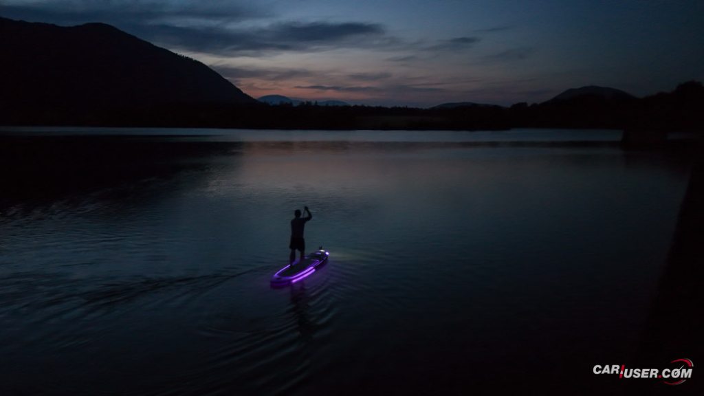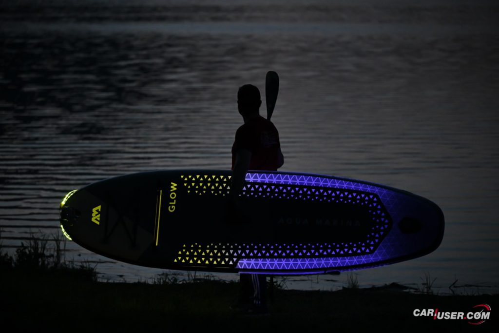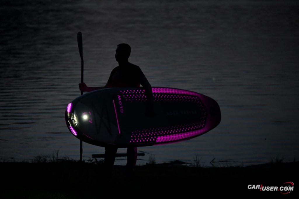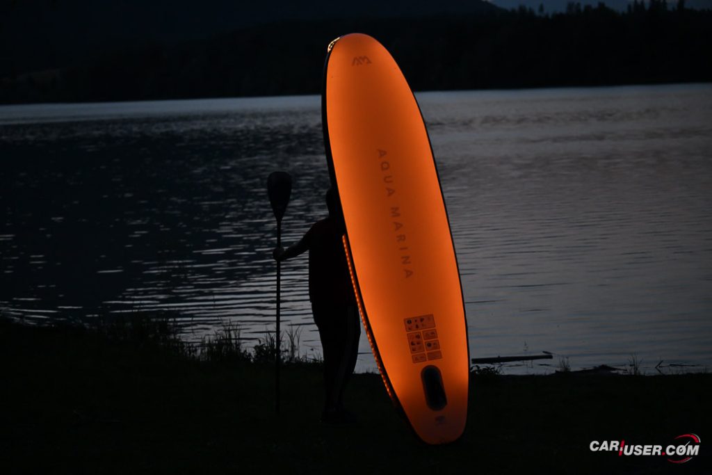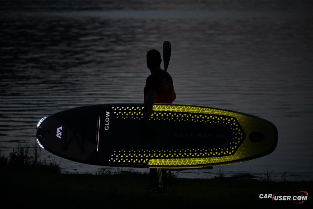 Ko smo Glowa preizkusili pri dnevni svetlobi, je bila to povsem običajna SUP-deska, čigar nosilnost je omejena s 140 kilogrami, v dolžino pa meri 315 centimetrov (D x Š x V: 315x 79 x 15 cm). Zaradi dolžine deske, je slednja prvenstveno namenjena predvsem enemu uporabniku, uporabiti pa jo moč tako na mirnih kot nekoliko bolj valovitih vodah. Toda, ko se je začelo mračiti …