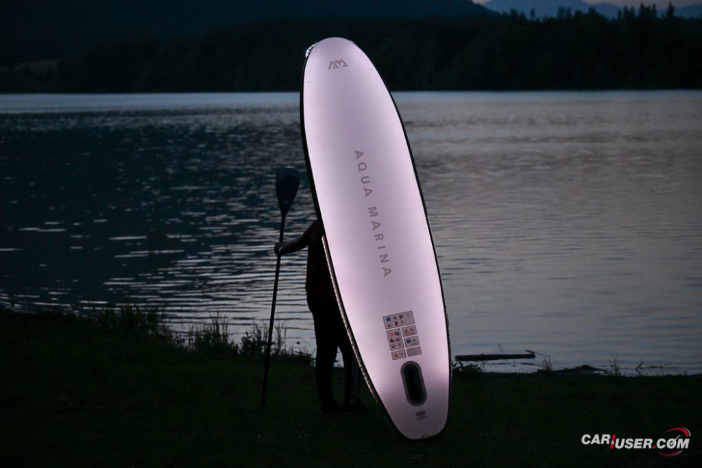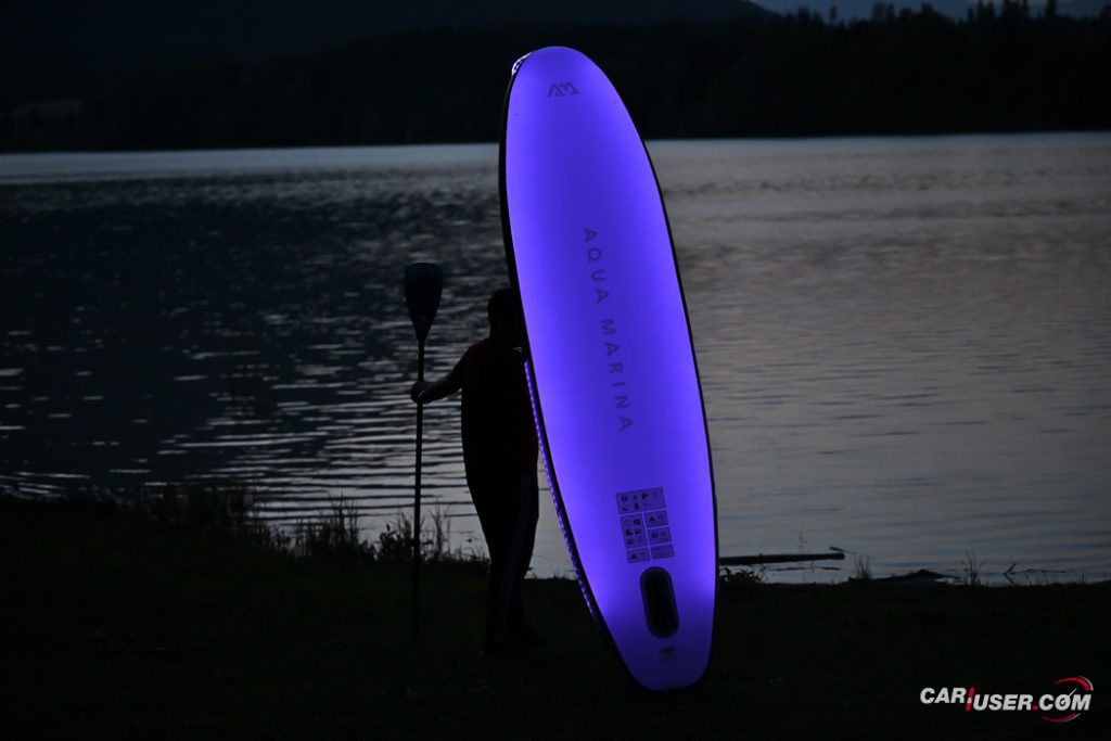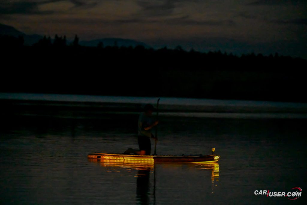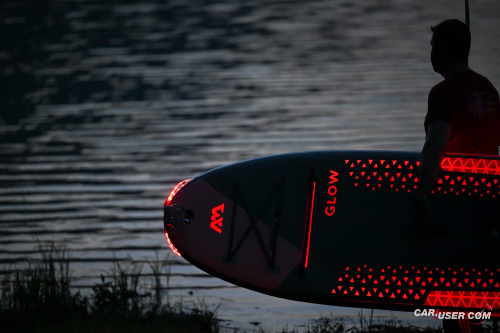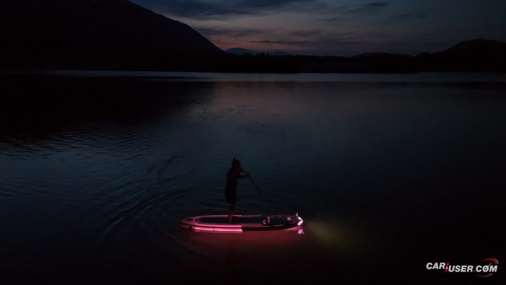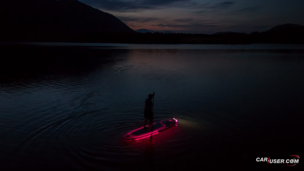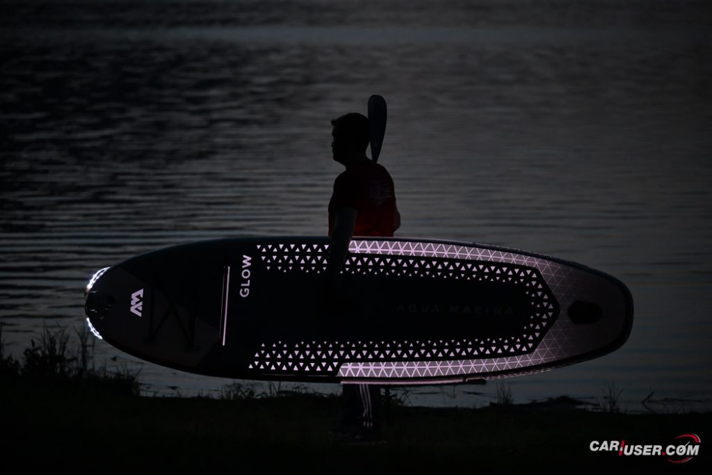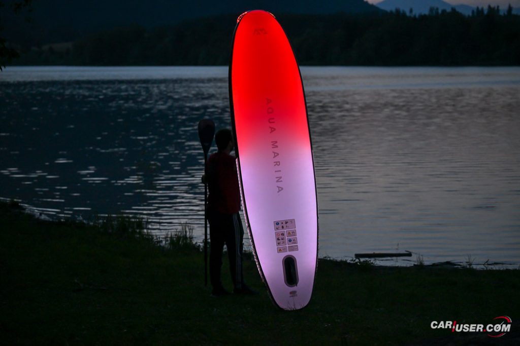 Ko smo Glowa preizkusili pri dnevni svetlobi, je bila to povsem običajna SUP-deska, čigar nosilnost je omejena s 140 kilogrami, v dolžino pa meri 315 centimetrov (D x Š x V: 315x 79 x 15 cm). Zaradi dolžine deske, je slednja prvenstveno namenjena predvsem enemu uporabniku, uporabiti pa jo moč tako na mirnih kot nekoliko bolj valovitih vodah. Toda, ko se je začelo mračiti …