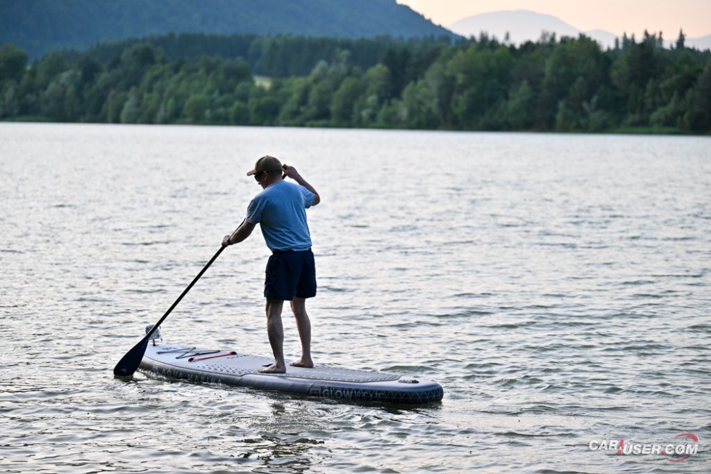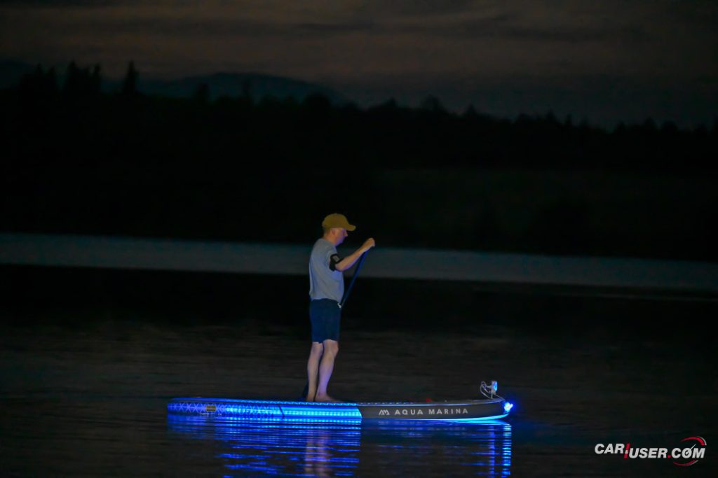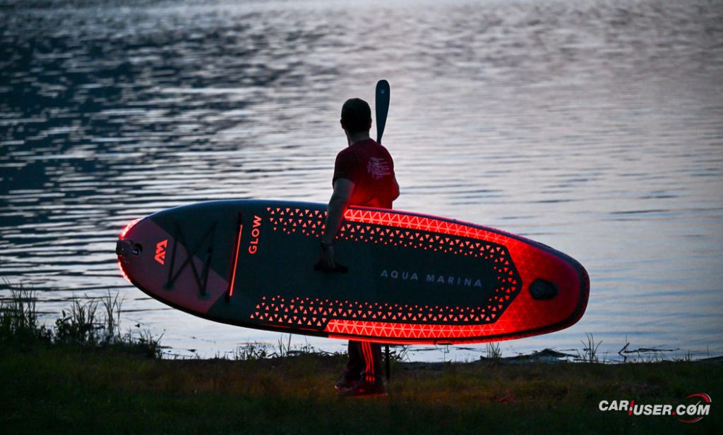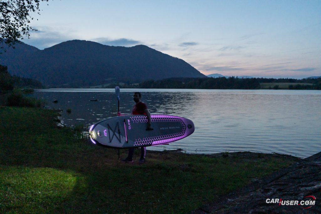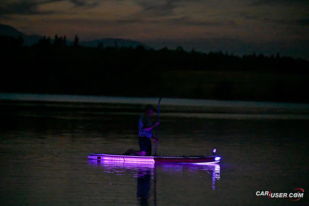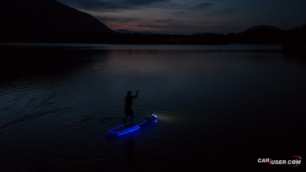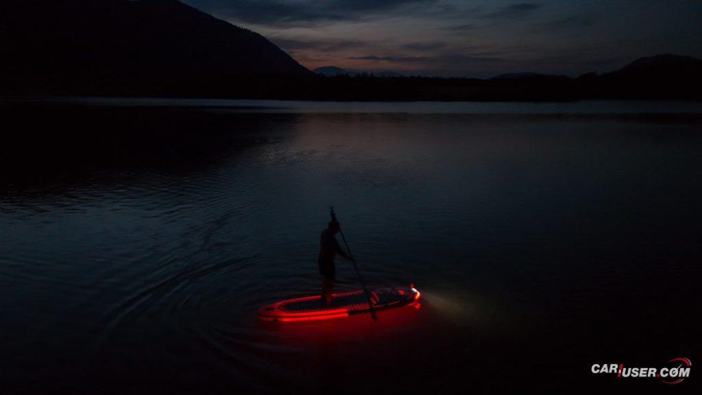 Ko smo Glowa preizkusili pri dnevni svetlobi, je bila to povsem običajna SUP-deska, čigar nosilnost je omejena s 140 kilogrami, v dolžino pa meri 315 centimetrov (D x Š x V: 315x 79 x 15 cm). Zaradi dolžine deske, je slednja prvenstveno namenjena predvsem enemu uporabniku, uporabiti pa jo moč tako na mirnih kot nekoliko bolj valovitih vodah. Toda, ko se je začelo mračiti …