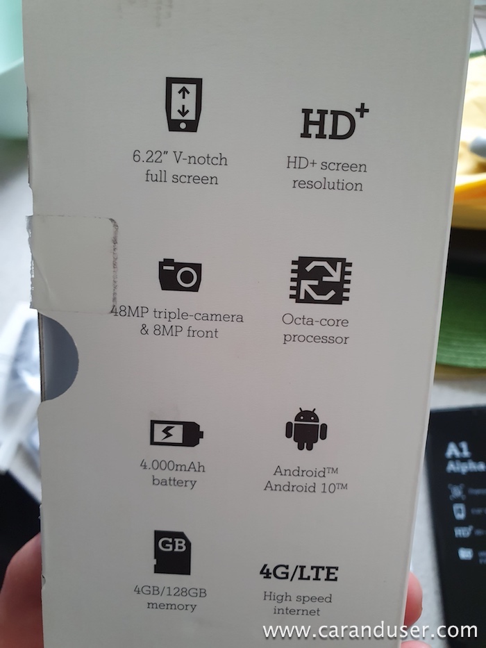 Premer zaslona A1 Alpha 20 meri 6,22 palca oziroma 15,8 centimetra, delovanje pa podpira HD+ resolucijo. Procesor z osmimi jedri črpa energijo iz baterije s kapaciteto 4.000 mAh, uporabniku pa je vse skupaj servirano preko operacijskega sistema Android 10. Mobilnik ima na hrbtni strani tri kamere (glavno, širokokotno in makro), vsi posnetki pa se shranjujejo na notranji pomnilnik s 128 GB prostora ali na uporabnikovo SD kartico.