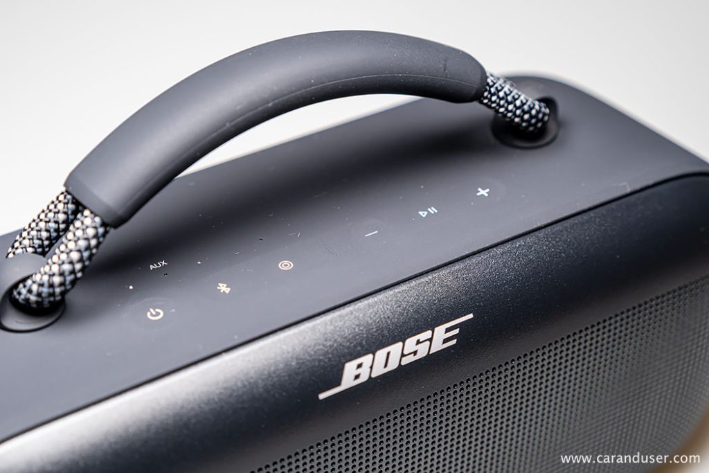 Na zgornjem delu se, poleg odstranljivega in zamenljivega ročaja, nahajajo kontrolne tipke zvočnika. Tako boste lahko brez uporabe aplikacije zvočnik prižgali, izbirali med različnimi viri glasbe, upravljali z glasnostjo zvočnika, ustavili in nadaljevali s predvajanjem glasbe ter poljubno nastavili dodatno tipko (funkcijo določite v Bose aplikaciji). Poleg omenjenih tipk sta na zadnji strani zvočnika še USB-C in AUX vhoda.
