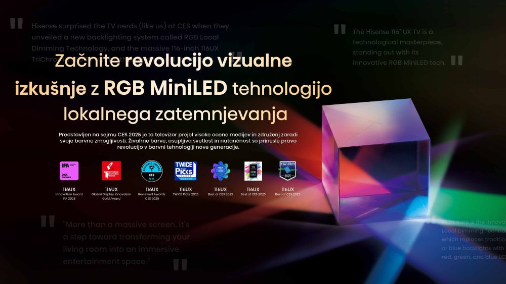 Hisense je to poletje predstavil prvi RGB MiniLED televizor na svetu. Poleg tega so lansirali največji RGB MiniLED televizor doslej – edinstveni 116-palčni model, ki postavlja nove standarde in prinaša nepozabno kinematografsko izkušnjo kar v udobje vašega doma.