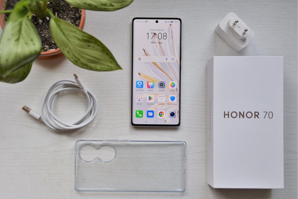 Honor 70 je vstavljen v konkretno škatlo, v kateri poleg aparata najdemo še priročen silikonski ovitek, hitri polnilec s podatkovnim kablom USB-C na USB-A ter navodila za uporabo. Žal v Sloveniji zaenkrat ni v ponudbi takšne različice, kot je tale preizkušena, z največjim notranjim spominom in v barvni kombinaciji Crystal Silver. Pri operaterjih bo Honor 70 v izdaji 8GB+128GB na voljo v črni (Midnight Black) in zeleni (Emerald Green) barvi in sicer po priporočeni prodajni ceni 599 evrov.