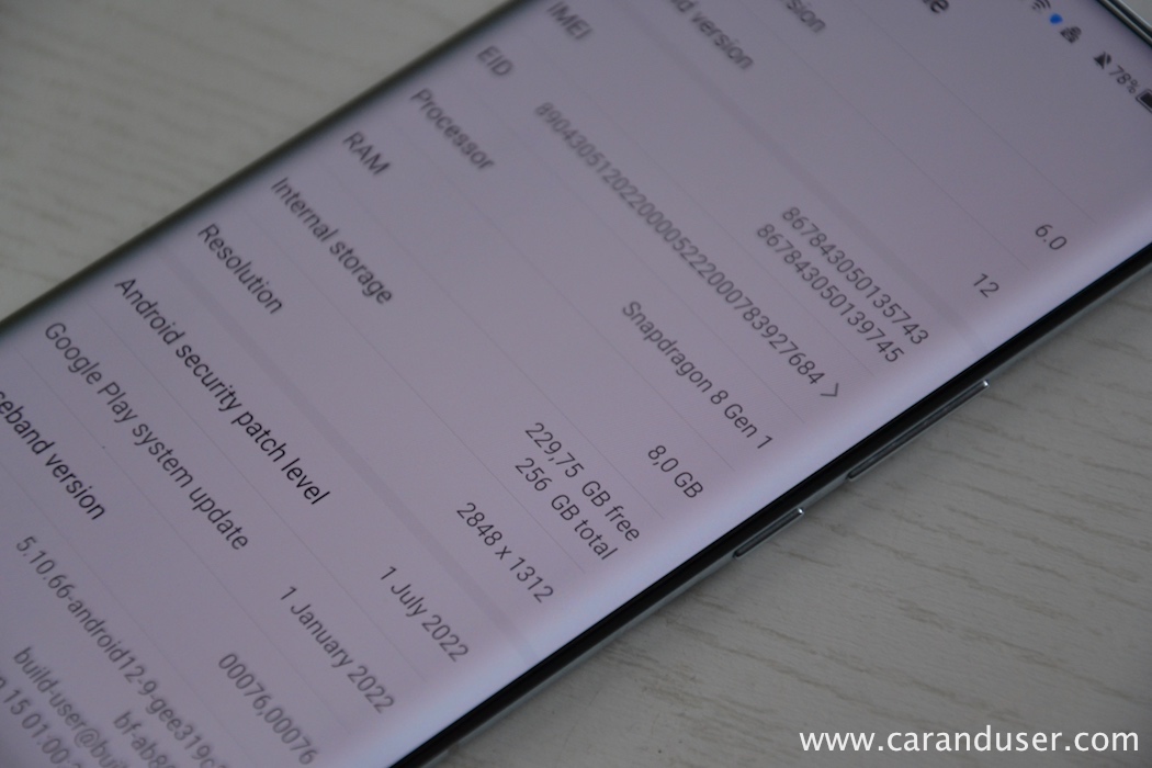 Pod zaslonom se nahaja čipovje Qualcomm SM8450 Snapdragon 8 Gen 1 in 8-jedrni procesor (1×3.00 GHz Cortex-X2 & 3×2.50 GHz Cortex-A710 & 4×1.80 GHz Cortex-A510) z grafično podporo Adreno 730. V osnovi telefon razpolaga z 8 GB delovnega pomnilnika ter 256 GB shrambe, ki je ni mogoče razširiti z SD kartico. Celotna izkušnja bazira na sistemu Android 12 in je kot takšna precej preprosta ter poznana množicam uporabnikov.