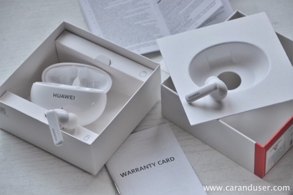 V lični škatli je poleg etuija s slušalkami zapakiran še polnilni kabel USB-A na USB-C, gumirani nastavki velikosti S in L, kratka navodila za uporabo ter garancijski list. Na hrbtni strani škatle je naveden izvleček tehničnih podatkov s spletne strani proizvajalca, a izkušnje iz prve roke na svojevrsten način razkrijejo kaj dejansko dobimo z nakupom brezžičnih slušalk Huawei FreeBuds 5i.