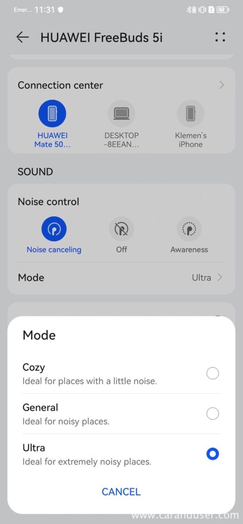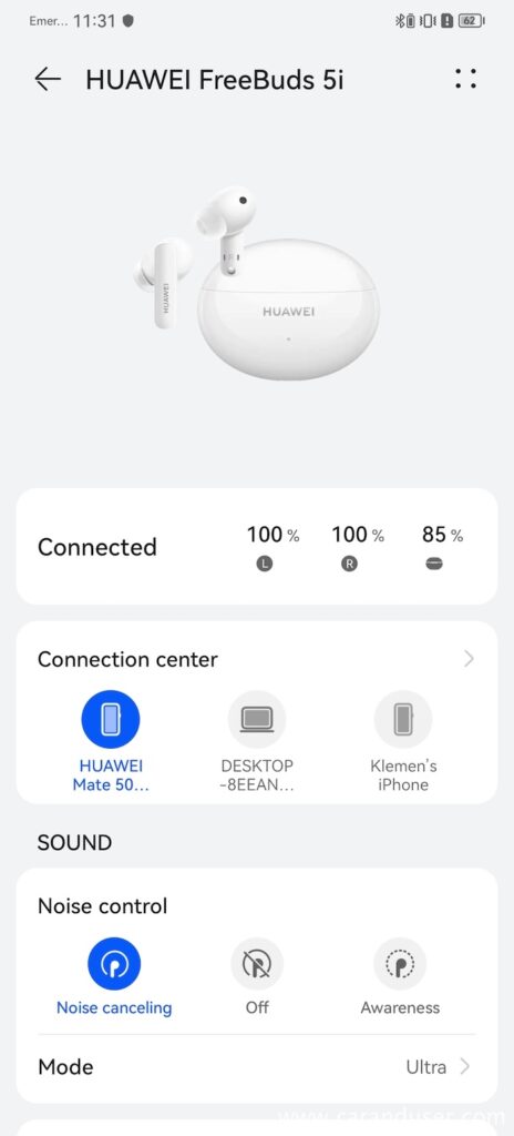 Seveda, tako se brezžične slušalke obnašajo, v kolikor funkcijo ”Noise canceling” nastavimo v program Ultra. Na voljo je še General in Cozy, za promet pa je denimo bolj priporočljiv program Awareness, ki prepušča delen hrup iz okolice. Možen je tudi popoln izklop delovanja ANC. In kot da že našteto ni dovolj, se Huawei FreeBuds 5i ponašajo še s kvalitetnim zvokom, katerega je moč korigirati s poudarkom na basih ali na visokih tonih (Treble). Preizkušeno na številnih vokalnih uspešnicah, zato si upam zapisati, da slišan zvok sovpada s tistimi slušalkami iz Berlina izpred nekaj let, ki so stala večkratnih teh. A še preden zaključimo s ceno, manjka še nekaj informacij.