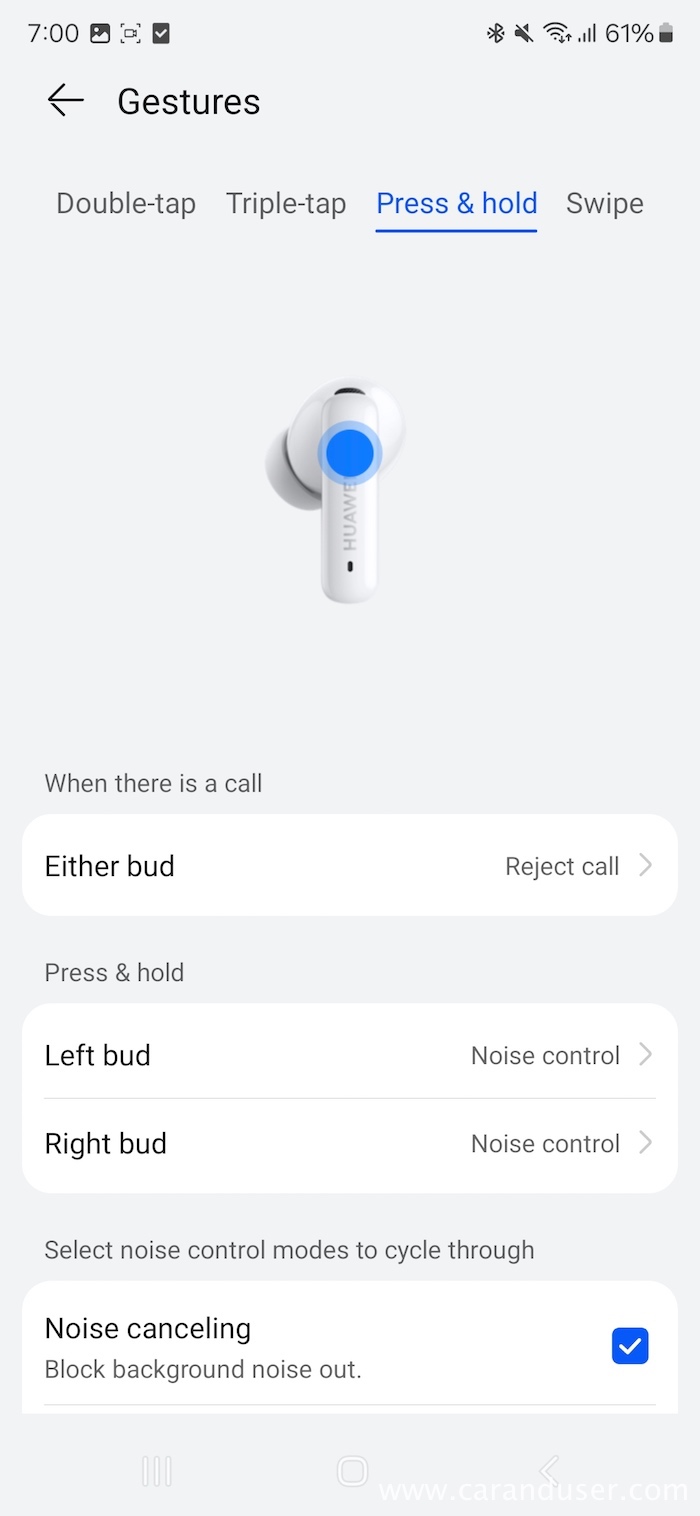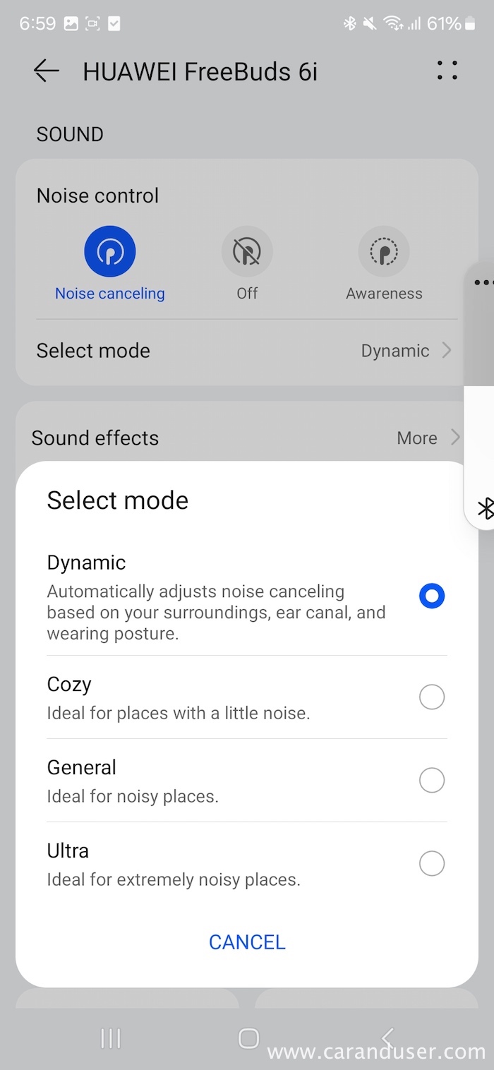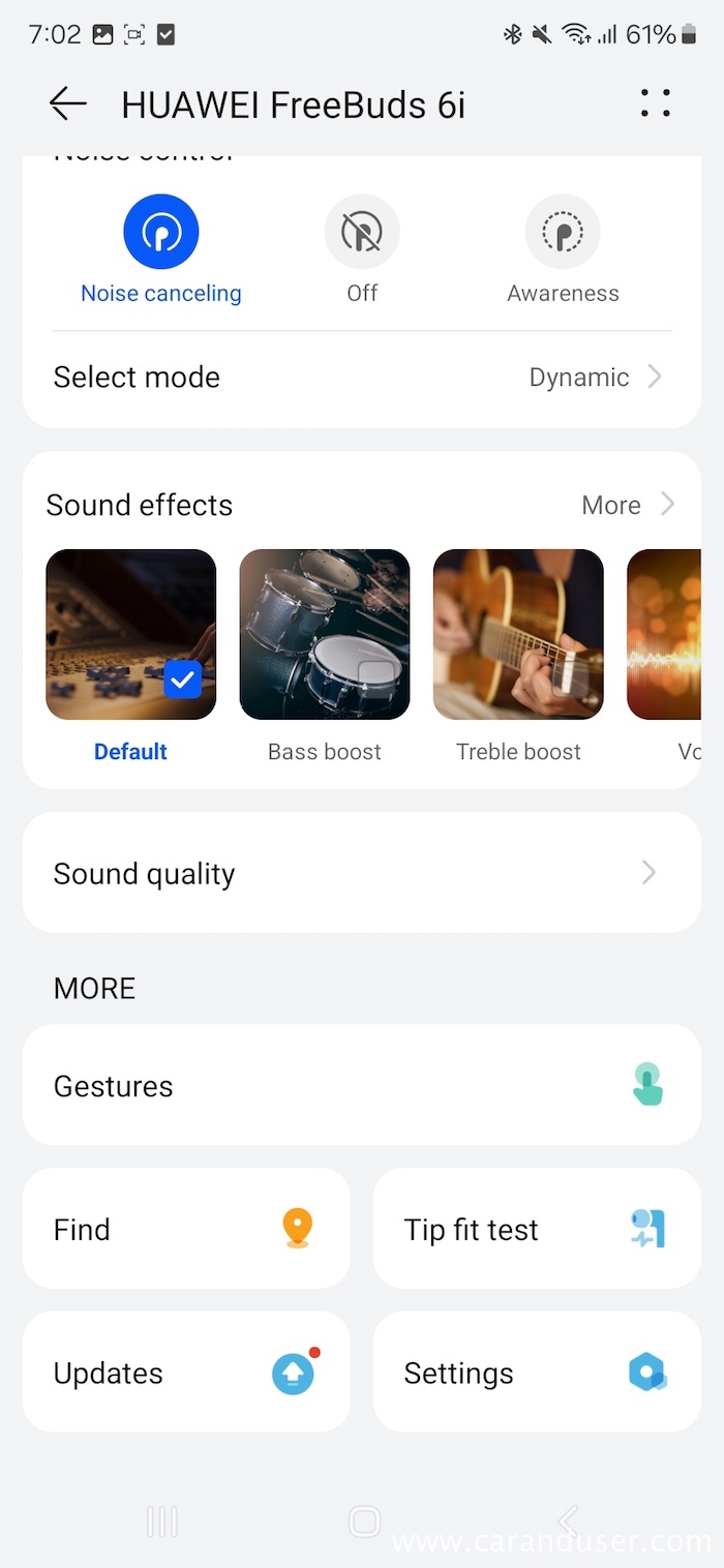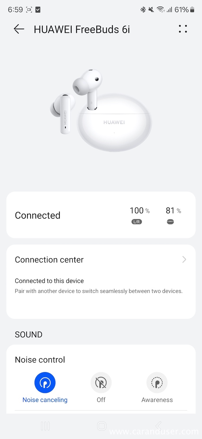 Ob preklopi funkcije odstranjevanja šumov z dotikom slušalke, je program ”Noise canceling” možno še dodatno nastaviti. Poleg dinamičnega uporabljanja (prednastavljeno), se lahko aktivira najbolj učinkovit program Ultra. Na voljo je še General in Cozy, za promet pa je denimo bolj priporočljiv program Awareness, ki prepušča delen hrup iz okolice. Možen je tudi popoln izklop delovanja ANC. In kot da že našteto ni dovolj, se Huawei FreeBuds 6i ponašajo še s kvalitetnim zvokom, katerega je moč korigirati s poudarkom na basih ali na visokih tonih (Treble).