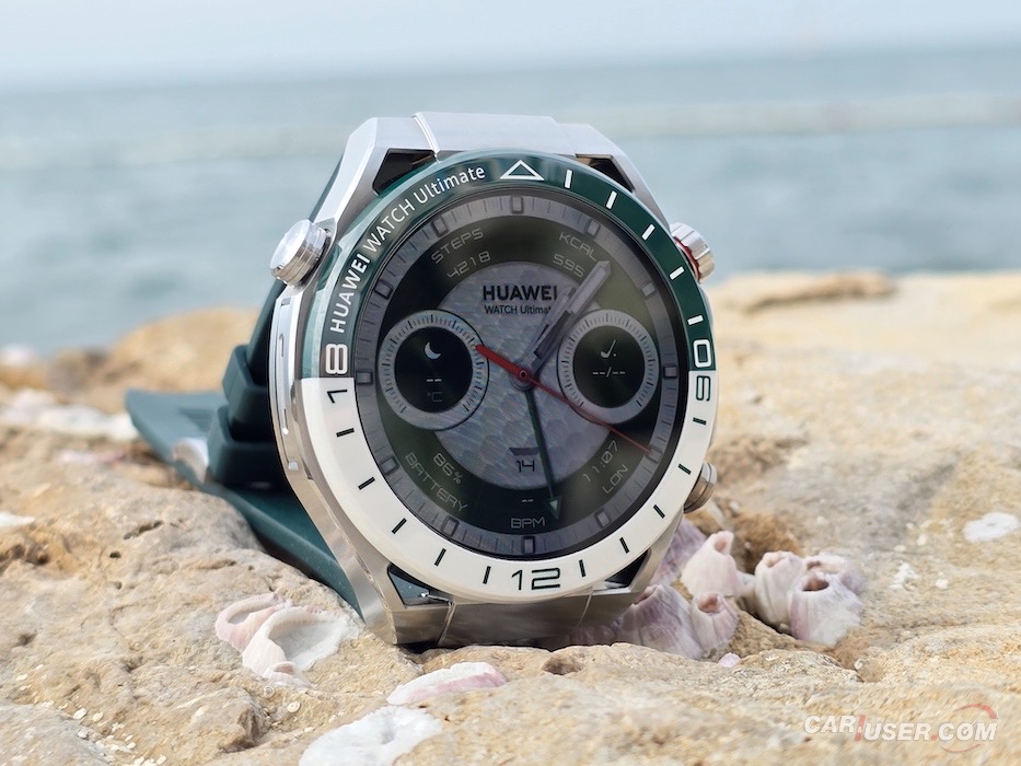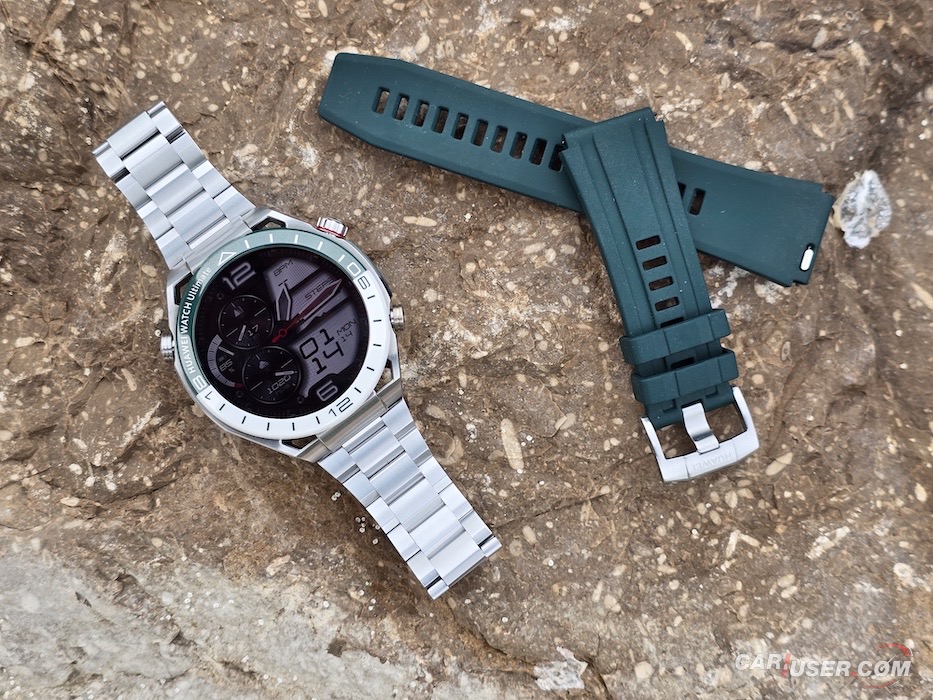 Ultimate je še kako vabljivo ime in prav je, da ga kupec opraviči. Za povrh pa mora imeti še konkretno zapestje, če ugibam, bi priporočil vsaj 17 cm obsega. Sam imam obseg zapestja 20 cm, kar je dovolj, da sem pregovorno jaz nosil uro in ne ona mene. Ohišje iz tekoče kovine na osnovi cirkonija v premer meri 48,5 mm in debelino 13 mm. Samo ohišje tehta 76 g, nudi do 100 m vodotesnosti ter nosi 1,5-palčni barvni zaslon LTPO AMOLED. Slednjega prekriva safirni kristal, ki poskrbi za dobro čitljivost ne glede na vremenske pogoje, dočim se zaslona oklepa trendna keramična luneta s 24-urno skalo na belo-zeleni podlagi.
