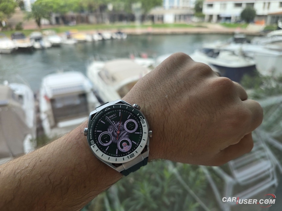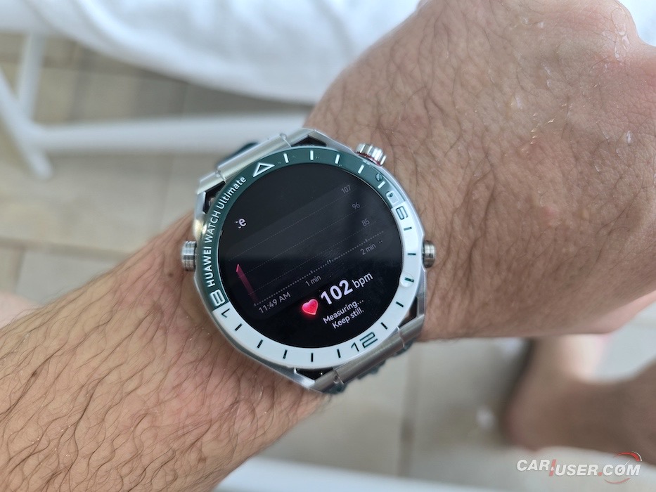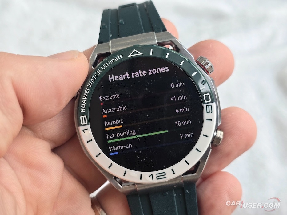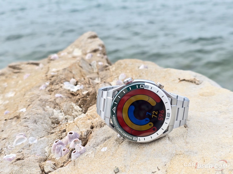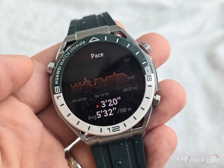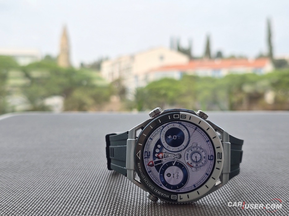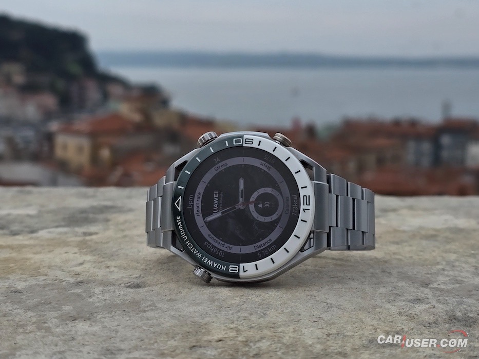 Ultimate je še kako vabljivo ime in prav je, da ga kupec opraviči. Za povrh pa mora imeti še konkretno zapestje, če ugibam, bi priporočil vsaj 17 cm obsega. Sam imam obseg zapestja 20 cm, kar je dovolj, da sem pregovorno jaz nosil uro in ne ona mene. Ohišje iz tekoče kovine na osnovi cirkonija v premer meri 48,5 mm in debelino 13 mm. Samo ohišje tehta 76 g, nudi do 100 m vodotesnosti ter nosi 1,5-palčni barvni zaslon LTPO AMOLED. Slednjega prekriva safirni kristal, ki poskrbi za dobro čitljivost ne glede na vremenske pogoje, dočim se zaslona oklepa trendna keramična luneta s 24-urno skalo na belo-zeleni podlagi.