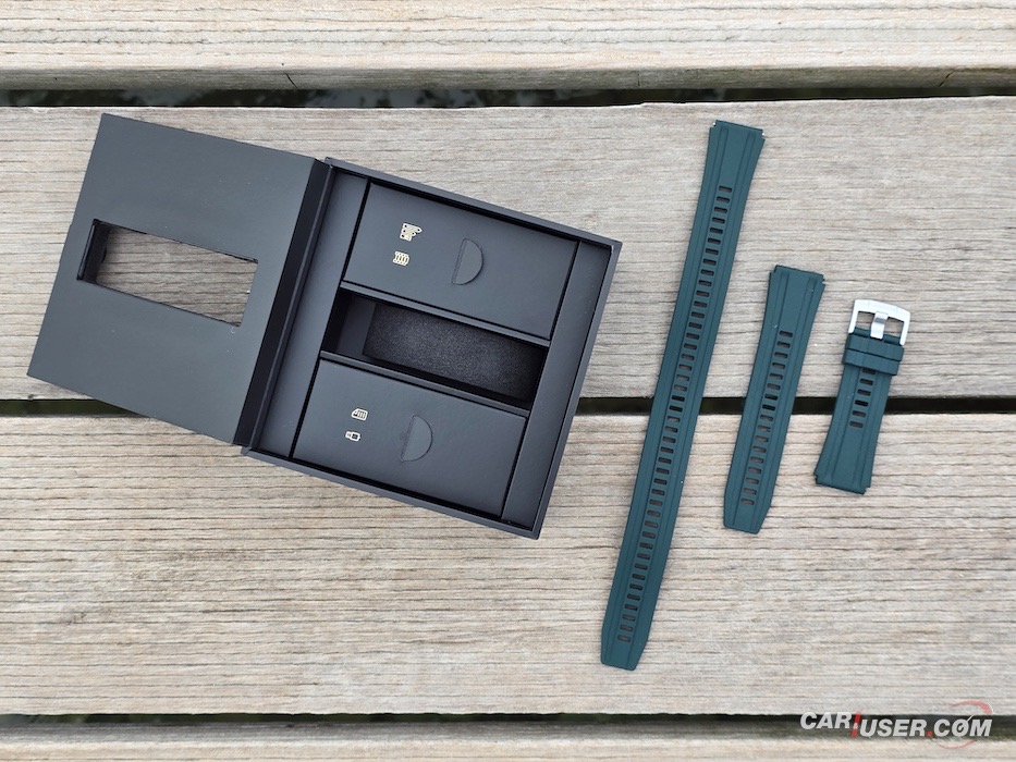 Tisto kar še dodatno prepriča je izkušnja odpiranja paketa. Material škatle je na otip kakovosten, prav tako obdelava. Z dvigom poličke, kjer vas pozdravi ura, se dokopljemo do segmentov s polnilno postajo, navodili, paščki ter dodatnimi členi zapestnice. Za nameček ljubitelji potapljanja v kompletu prejmejo še podaljšano varianto drugega dela paščka iz kavčuka.
