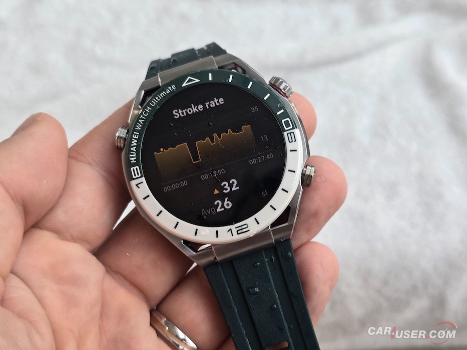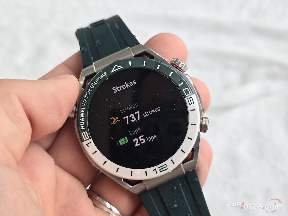 V vodi se zaslon preventivno izklopi, na željo pa ga je moč aktivirati. Ura poleg že znanih telesnih parametrov beleži število zamahov in opravljene rotacije oziroma dolžine bazena. Skupek informacij nato demonstrira v katerem območju plavaš, torej ali kuriš maščobe ali gradiš mišice. Seveda aplikacija podatke grafično olepša, medtem ko ti ura po plavanju priporoči fazo umirjanja ter »izpih« ure.