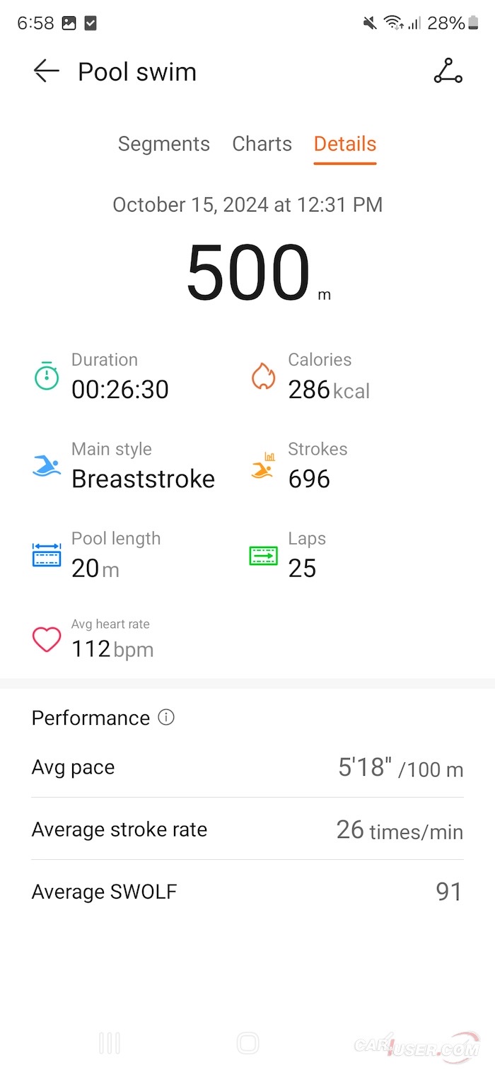 Posledično dnevne aktivnosti ne vplivajo na izbiro zapestnice oziroma paščka, a nekako najbolje se v vodi znajde kavčuk. Plavanje v bazenu s slano vodo ima svojevrsten čar, ki ga je tokrat dopolnila še funkcija merjenja plavanja. Karkoli naj bi že to pomenilo, saj si nisem znal predstavljati, da lahko ura dejansko postreže s takšnimi parametri. Še pred prvim zamahom sem vnesel točno dolžino bazena in sledil je cilj s preplavanimi 500 m.