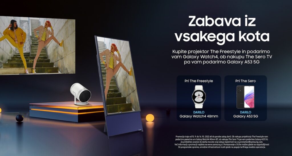 Če se boste do 16. oktobra odločili za nakup projektorja The Freestyle boste kot darilo prejeli uro Galaxy Watch4 40 mm BT, ki bo sledila vsakemu vašemu koraku. Televizor The Sero pa vam bo kot darilo prinesel še Galaxy A53 5G. Več podrobnosti o ugodnostih je na voljo na spletni strani podjetja.