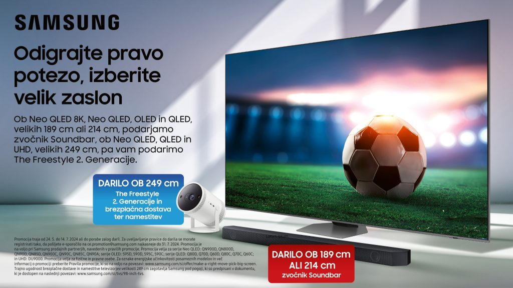 Novi Samsung televizorji so sedaj na voljo tudi v posebni ponudbi! Ob nakupu izbranih Samsung velikih zaslonov prejmete posebne ugodnosti, samo do 14. julija 2024 oziroma do porabe zalog. Če izberete Neo QLED 8K, Neo QLED, OLED ali QLED zaslon velikosti 189 cm ali 214 cm, prejmete zvočnik Soundbar. Pri nakupu Neo QLED, QLED ali UHD zaslonov velikosti 249 cm pa prejmete za darilo projektor The Freestyle 2. generacije, skupaj z brezplačno dostavo in montažo. Več o ponudbi najdete tukaj.