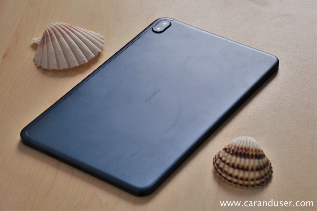 Nokia T20 razpolaga z 10,4 palčnim zaslonom, kar dimenzijsko znaša 247.6 mm v dolžino, 157.5 mm v širino ter 7.8 mm višino. Tablični računalnik zavoljo aluminijastega ohišja na ”vagi” pokaže 465 g, kar predstavlja maso dveh (masivnejših) ali treh pametnih telefonov. Pozornost mi je ukradel lep, ”peskan” zaključni sloj v oceansko modri barvi. Seveda kliče po prstnih odtisih, a je škoda to pomirjajočo skandinavsko tematiko prekriti z ovitkom, kateri vam sicer prinese kakšno dodatno možnost postavitve tablice. To pa bo kar priporočljivo, saj je z ergonomskega stališča med večurnim rokovanjem z napravo, dobro zamenjati pozicije. Eden od razlogov je mogoče tudi malce nerodno postavljen 3,5 mm (jack) priklop za slušalke na spodnjem desnem robu, ki zna biti nekoliko v napoto, če tablico držite v ”kino” načinu. Verjamem, da vas večina že uporablja brezžične slušalke.