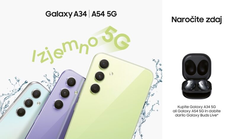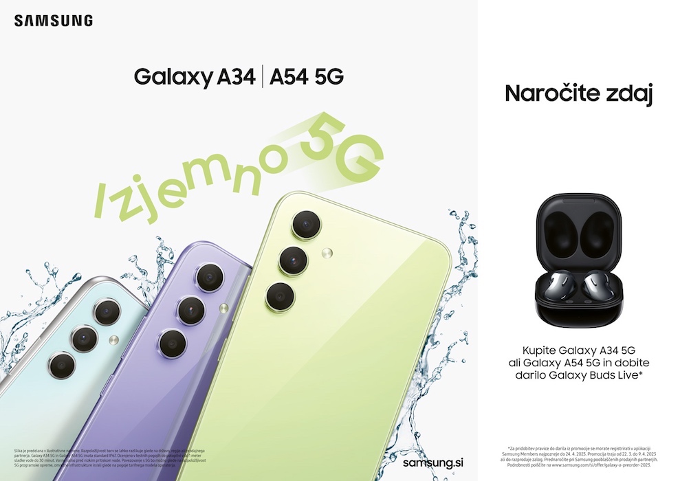 Ob naročilu telefona Galaxy A54 5G ali Galaxy A34 5G brezplačno prejmete slušalke Galaxy Buds Live za še popolnejšo Galaxy izkušnjo. Promocija traja od 22. marca do 9. aprila 2023 oziroma do razprodaje zalog. Več o ponudbi in naročilu najdete na spletni strani Samsung.