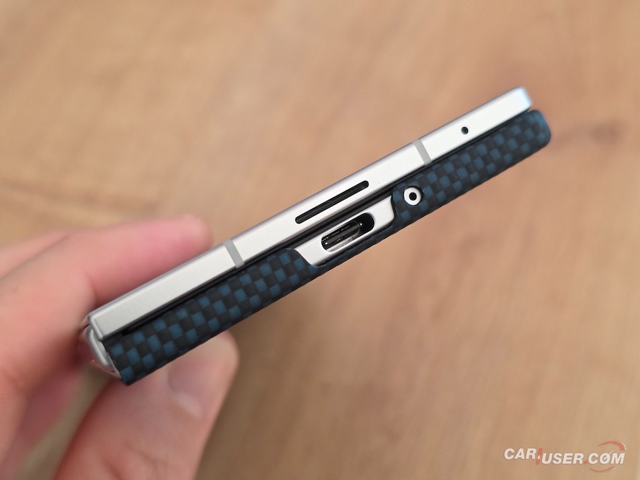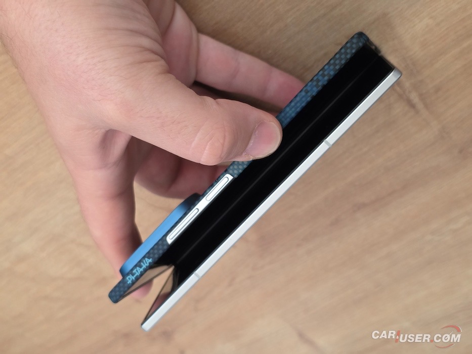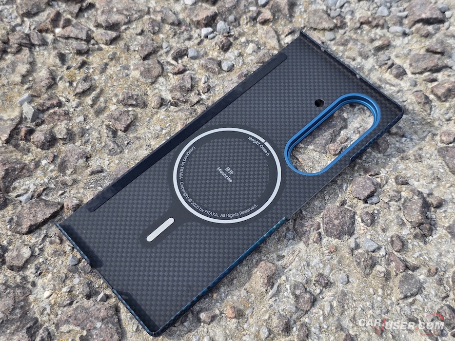Ovitek Moonrise se perfektno prilega oblinam modela Fold7 in ponuja natančne izreze za USB-C priključek, zvočnike, bliskavico, stranska gumba in trojno kamero. Pomembno je poudariti, da se je Pitaka odločila za ovitek, ki pokriva le hrbtno stran telefona. Tako brez zaščite ostaja sprednji zaslon ter tečaj. Rezultat je ”ultra tanek” profil aparata Fold7, ki sicer pusti ranljive dele nekoliko izpostavljene.