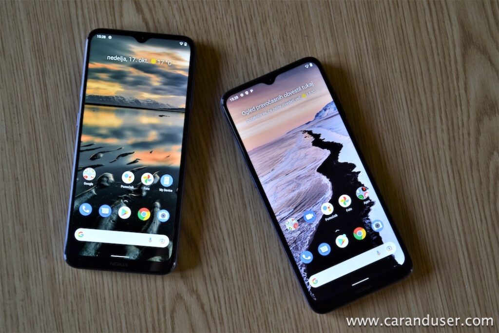 Nokia G10 in G20 sta si pravzaprav tako podobna hišna pametna telefona, da ju s težavo ločimo, če ne aktiviramo njuna zaslona (seveda, če imata nastavljeni različni ozadji oziroma postavitev ikon 😊) ali obrnemo na hrbet, kjer razberemo razliko na podlagi števila kamer in postavitve bliskavice. No, različna je še tekstura površine zadnjega pokrova ter barvne kombinacije. Mimogrede, G20 impresionira z všečnim prelivanjem barv na svetlobi!