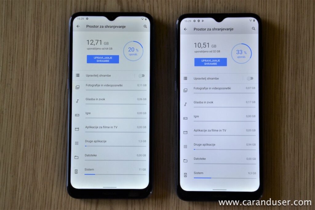 Teh ni veliko, bodo pa za marsikoga ključne. Nokio G10 poganja 8-jedrni procesor MTK Helio G25, 8x A53 2,0 GHz s tehnologijo HyperEngine, medtem ko je čipovje v Nokii G20 8-jedrni Mediatek G35 8x A53 2,3 GHz. Interna shramba je pri modelu G10 odmerjena na 32 GB, dočim na drugi strani G20 premore še enkrat toliko, 64 GB. Res pa je, da oba modela ponujata režo za SD kartico, katere kapaciteta lahko doseže 512 GB. In zadnja razlika v drobovju je velikost pomnilnika (RAM), Nokia G10 razpolaga s 3 GB, Nokia G20 pa s 4 GB.