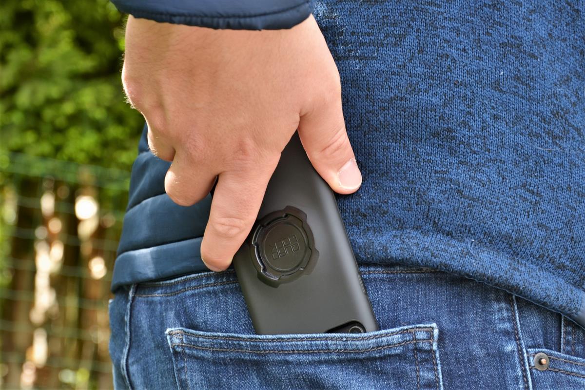 Omembe vredno je še kombiniranje nastavkov držal, saj se denimo lahko glava za brezžično polnjenje priklopi tako na držalo za v avtomobil kot na tistega za v pisarno. Najpomembneje pri vsem tem pa je, da se Quad Lock dodatek na ovitku pravzaprav ne čuti. Tipski ovitek je sicer nekoliko debelejši, a še vedno ne tako kot kakšni varnostni ovitki. Obdan je v prijeten, nedrseč material, ki začuda ne ljubi prstnih odtisov. Rokovanje je zavoljo tega okretno, telefon lepo zdrsne v zadnji žep oziroma se ga lepo drži v rokah med pogovorom.
